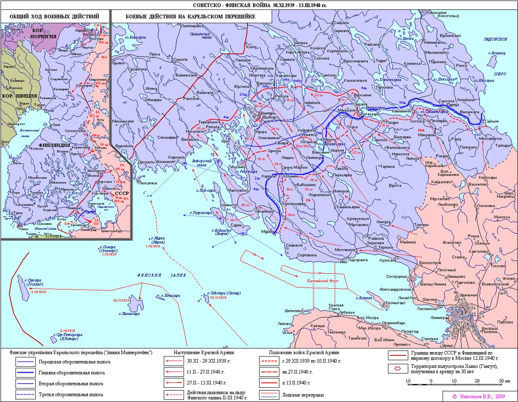 Главный удар наносился Красной Армией на Карельском перешейке с целью последующего прорыва к столице Финляндии Хельсинки. Вспомогательный удар наносился севернее Ладожского озера. Здесь, на труднодоступной местности, советские войска действовали крайне неудачно. Финнам удалось окружить несколько советских соединений и взять много пленных. Успешны были только действия 14-й советской армии в Заполярье. Она захватила единственный финский порт в Баренцевом море Петсамо, но далее развивать успех в условиях тундры не могла. Штурм же линии Маннергейма на Карельском перешейке к 30 декабря 1939 года закончился полным провалом. Удалось добиться лишь нескольких незначительных вклинений. Советское командование имело очень слабое представление о финских укреплениях. Штурм возобновился 1 февраля 1940 года, после того как численность советских войск на Карельском перешейке более чем удвоилась, и все войска, действовавшие против Финляндии, были объединены в Северо-Западный фронт под командованием командарма 1-го ранга Семена Тимошенко. В 20-х числах февраля ценой больших потерь линия Маннергейма была прорвана. 13 марта, в день заключения мира, бои велись на тыловом оборонительном рубеже в районе Выборга. В этот день советские войска предприняли безуспешный и совершенно бессмысленный штурм Выборга, который по условиям заключенного накануне Московского мирного договора все равно отходил к СССР.