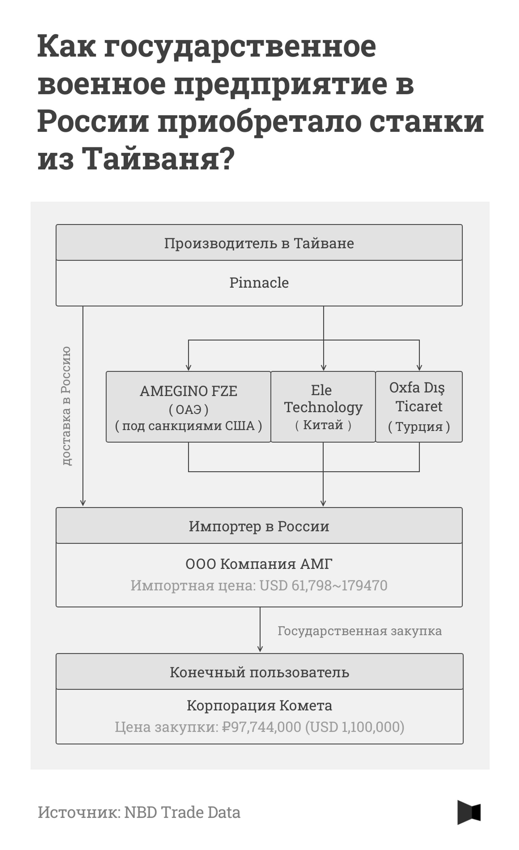АМГ станки достались намного дешевле. После того, как Тайвань усилил экспортный контроль, компания с марта по июль 2023 года приобрела девять станков Pinnacle через трейдеров в Объединенных Арабских Эмиратах, Турции и Китае за $60–180 тысяч каждый. Сравните с миллионом, который заплатила «Корпорация Комета» по госконтракту.