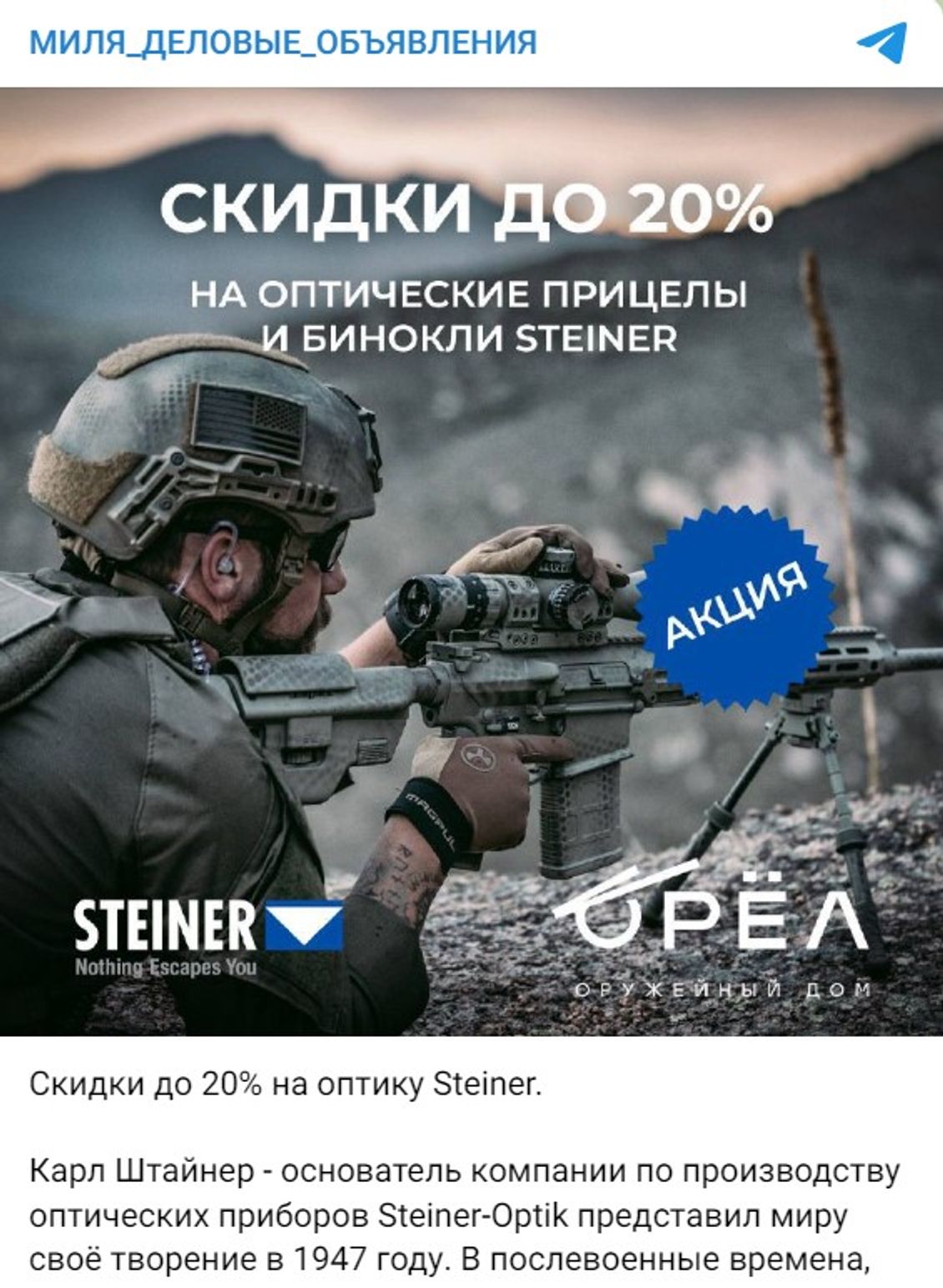 Российские импортеры настолько не чувствуют недостатка в продукции холдинга, что в сентябре 2023 года оружейный дом «Орел» анонсировал акцию с 20-процентной скидкой на бинокли и прицелы Steiner. Информацию об этом можно найти в снайперском Telegram-канале «Миля», где, в частности, покупают амуницию участники боевых действий и наемники «частных» военных компаний.