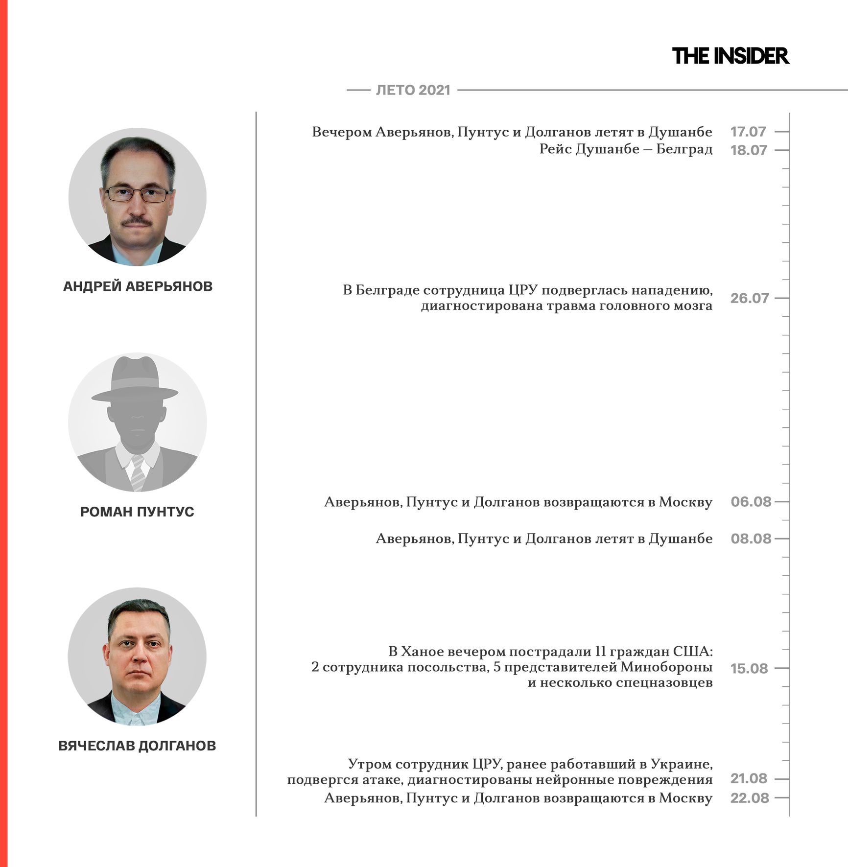 К примеру, в 2021 году перед инцидентом в Тбилиси генерал Аверьянов и его команда совершают еще несколько рабочих поездок, которые каждый раз совпадают с эпизодами «гаванского синдрома». Так, вечером 17 июля 2021 года Андрей Аверьянов, Роман Пунтус и Вячеслав Долганов отправляются в Душанбе и возвращаются в Россию в начале августа. Куда они летали, неизвестно, но на следующее утро, 18 июля, из Душанбе вылетал рейс в Белград, а 26 июля в Белграде произошел инцидент с дислоцированной в Сербии сотрудницей ЦРУ, раньше работавшей в отделе, который занимался Россией.