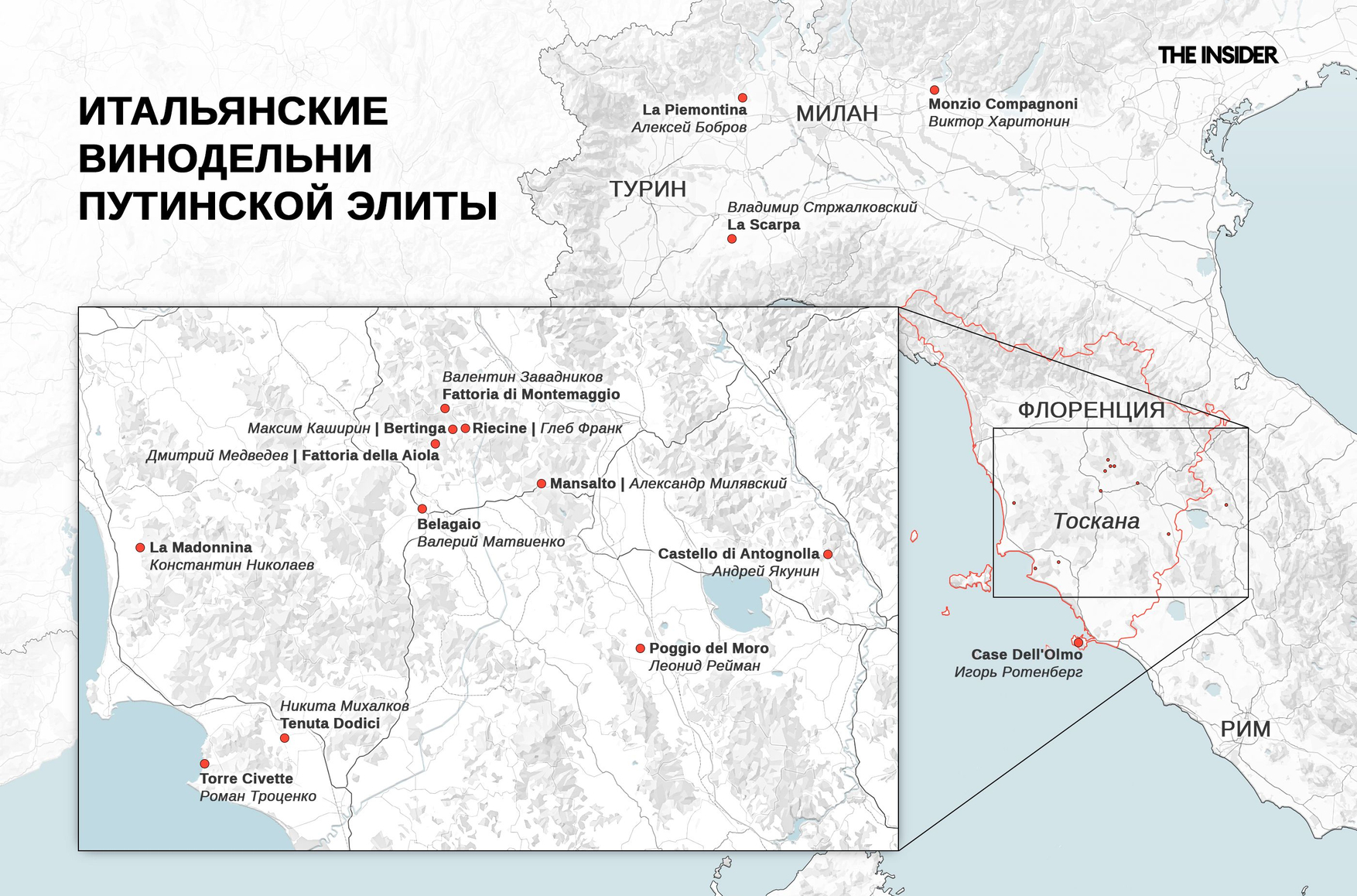 Винодельни российской элиты в Италии давно уже становятся объектом шумных скандалов в СМИ и, казалось бы, после начала полномасштабного вторжения путинское окружение должно было забыть о своих виноградниках. Однако, как выяснил The Insider, винодельный бизнес путинских друзей процветает. Так, например, итальянская винодельня Дмитрия Медведева, миноритарным акционером которой остается его однокурсник Илья Елисеев, продолжает получать субсидии ЕС прямо во время войны. Сын Аркадия Ротенберга Игорь Ротенберг все так же владеет поместьем в Тоскане спустя одиннадцать лет после обращения ФБК в финансовую полицию Италии. А связанный с Сечиным олигарх Роман Троценко сохранил контроль над аэропортом в Тоскане, который используют ВВС Италии, переписав его на подругу своей жены.