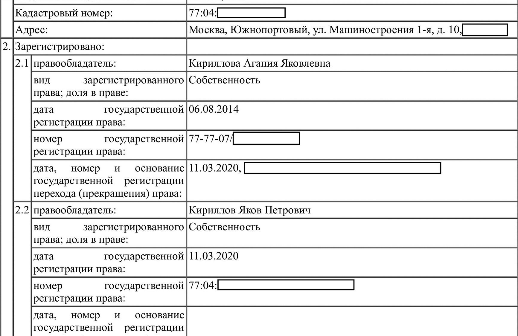 Квартира была приобретена в 2014 году на имя Кирилловой Агапии Яковлевны, 1932 года рождения — свекрови главы Мосгоризбиркома. На момент покупки Агапии Яковлевне было 82 года, какой-либо информации о занятии бизнесом и участии в юридических лицах The Insider найти не удалось. Чета Кирилловых же за пять предыдущих покупке квартиры лет суммарно заработала менее 19 млн рублей.