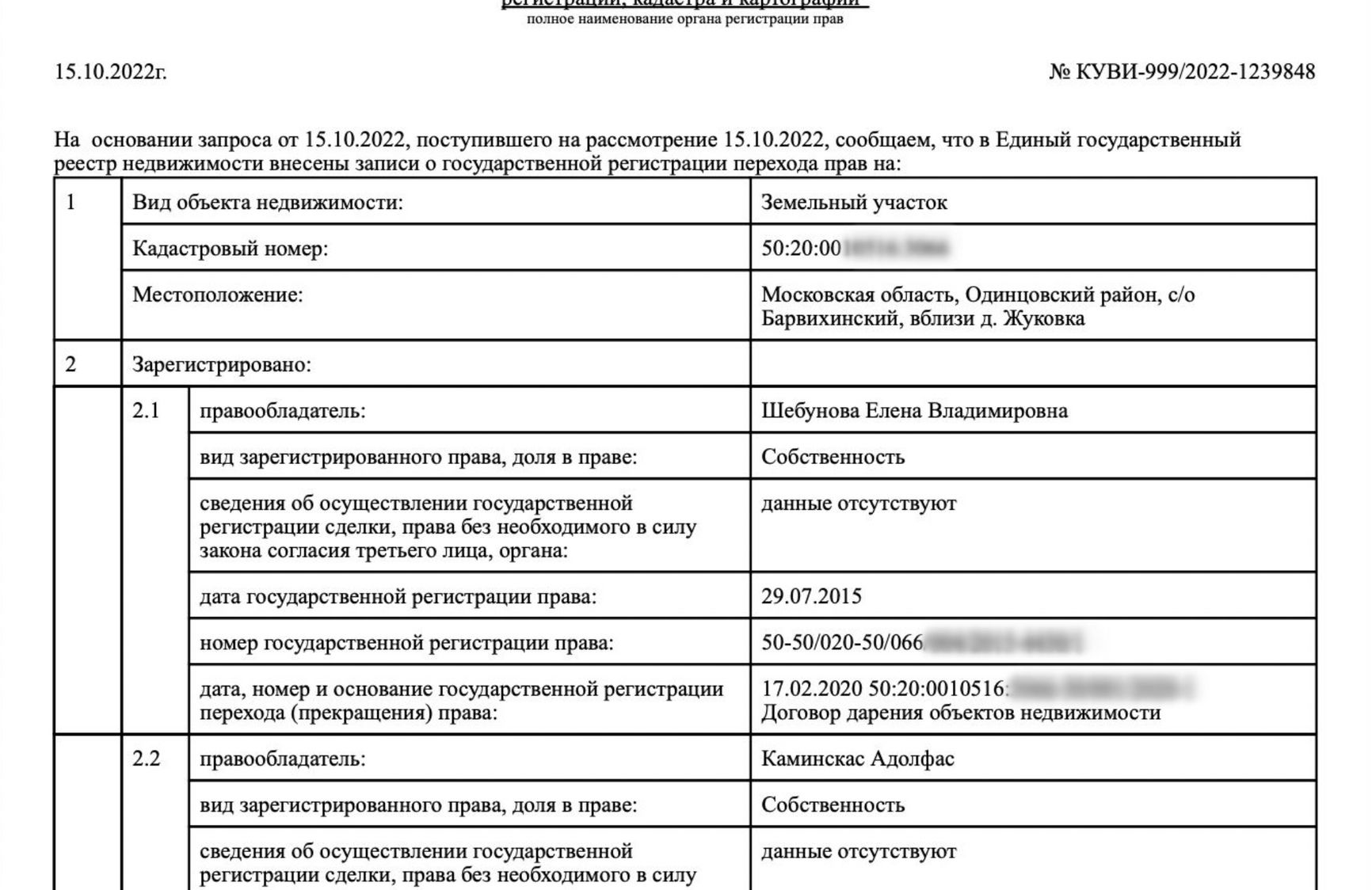 Согласно полученным из Росреестра данным, в 2020 году Шебунова подарила своему мужу имение в Жуковке. 5 октября 2022 года Адолфас Каминскас по договору дарения вернул недвижимость жене.