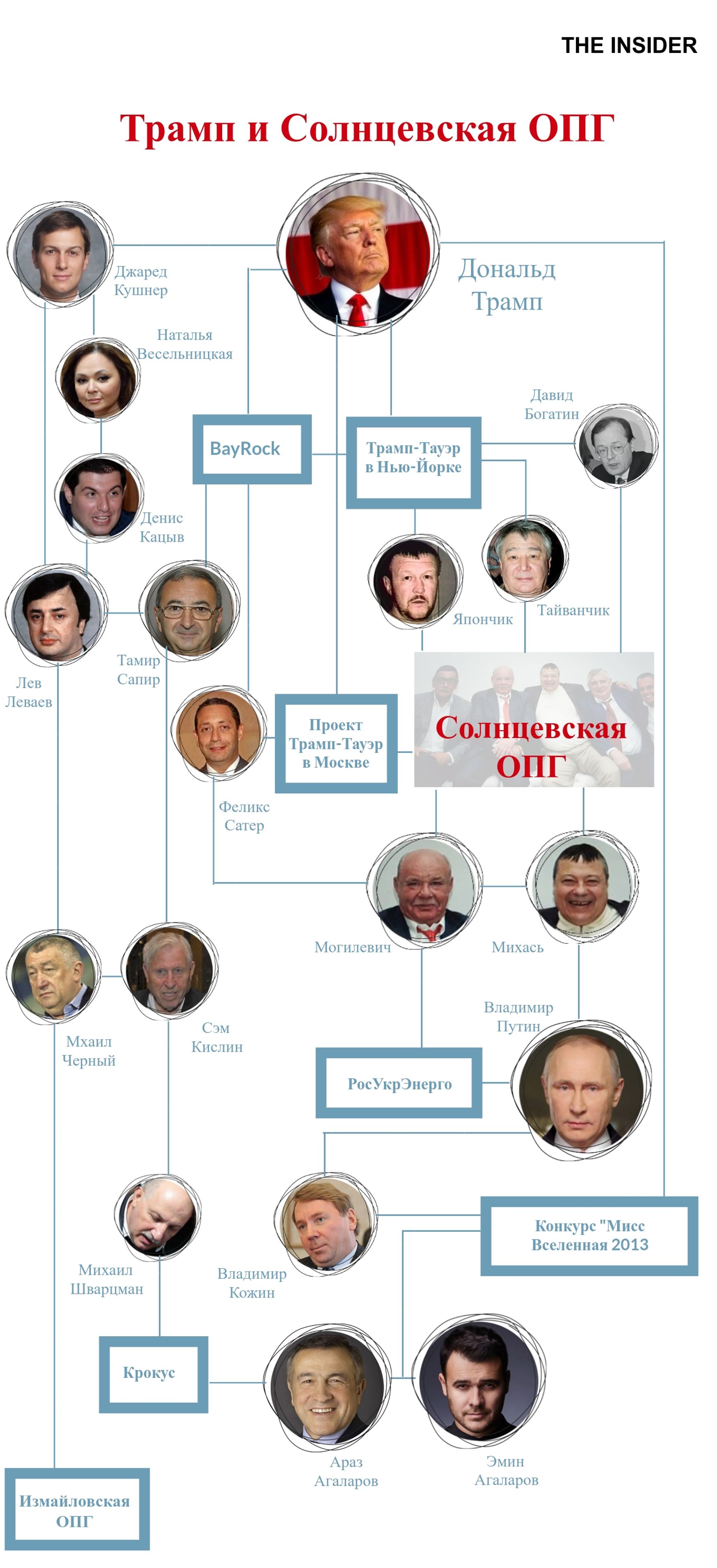 Дональд Трамп, в отношении которого продолжается расследование о сговоре с Кремлем, пытался выйти на российский рынок через Солнцевскую преступную группировку, а его контакты с российской организованной преступностью намного шире, чем предполагалось ранее. The Insider собрал воедино данные от свидетелей и следственных органов разных стран и выяснил, что связывает Трампа с Михасем и Могилевичем, как русская мафия оказалась интегрирована в команду американского президента и какое отношение к этому имеют российские спецслужбы.