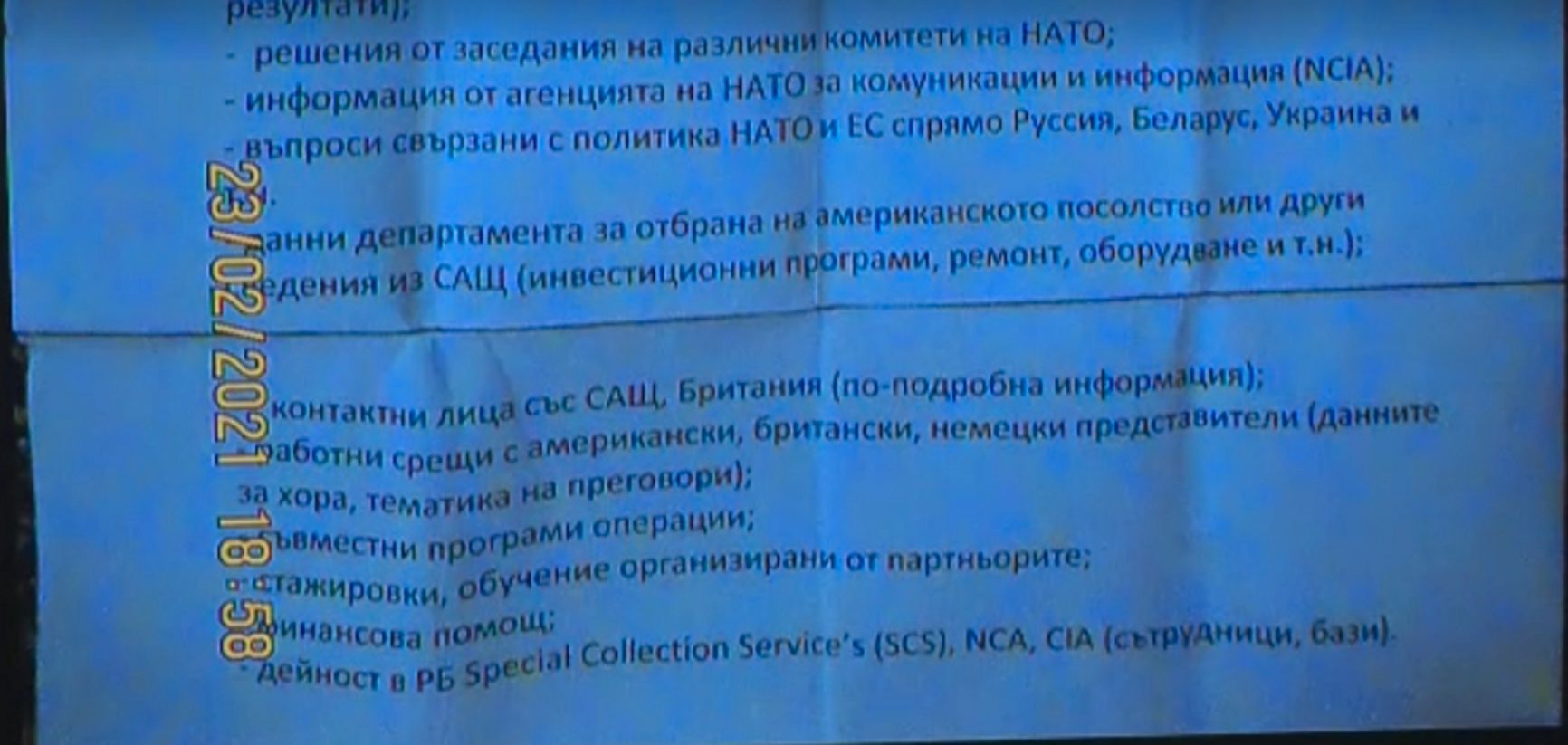 В задачи, которые поставило ГРУ, входило создание снимков экрана компьютеров в Минобороны, на которых были конфиденциальные данные. Особый интерес Москвы вызвали темы, связанные с Сирией, Украиной, Нагорным Карабахом. Памятка по задачам для новых резидентов была написана на ломанном болгарском языке с частыми русскими предлогами и словами. В задачи входили данные по встречам НАТО, политики ЕС в отношении России, Украины и Беларуси, а также внешние контакты Болгарии с США, Великобританией, Германией и CIA.