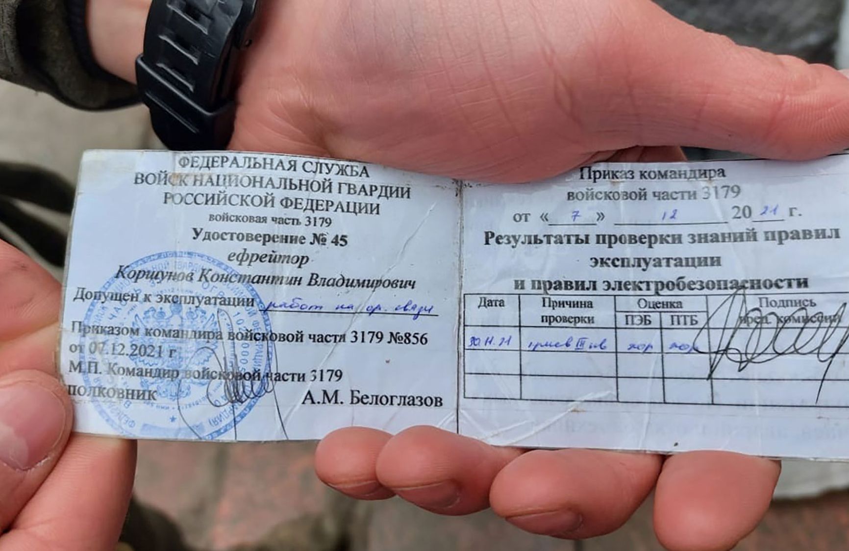 В здании на Яблунской улице, где располагался штаб российских военных, рядом с которым были найдены восемь тел, члены Нацгвардии Украины нашли удостоверение личности на имя Константина Коршунова. Журналисты Reuters идентифицировали его как военнослужащего воинской части № 3179, которая принадлежит к подразделению Росгвардии «Витязь».