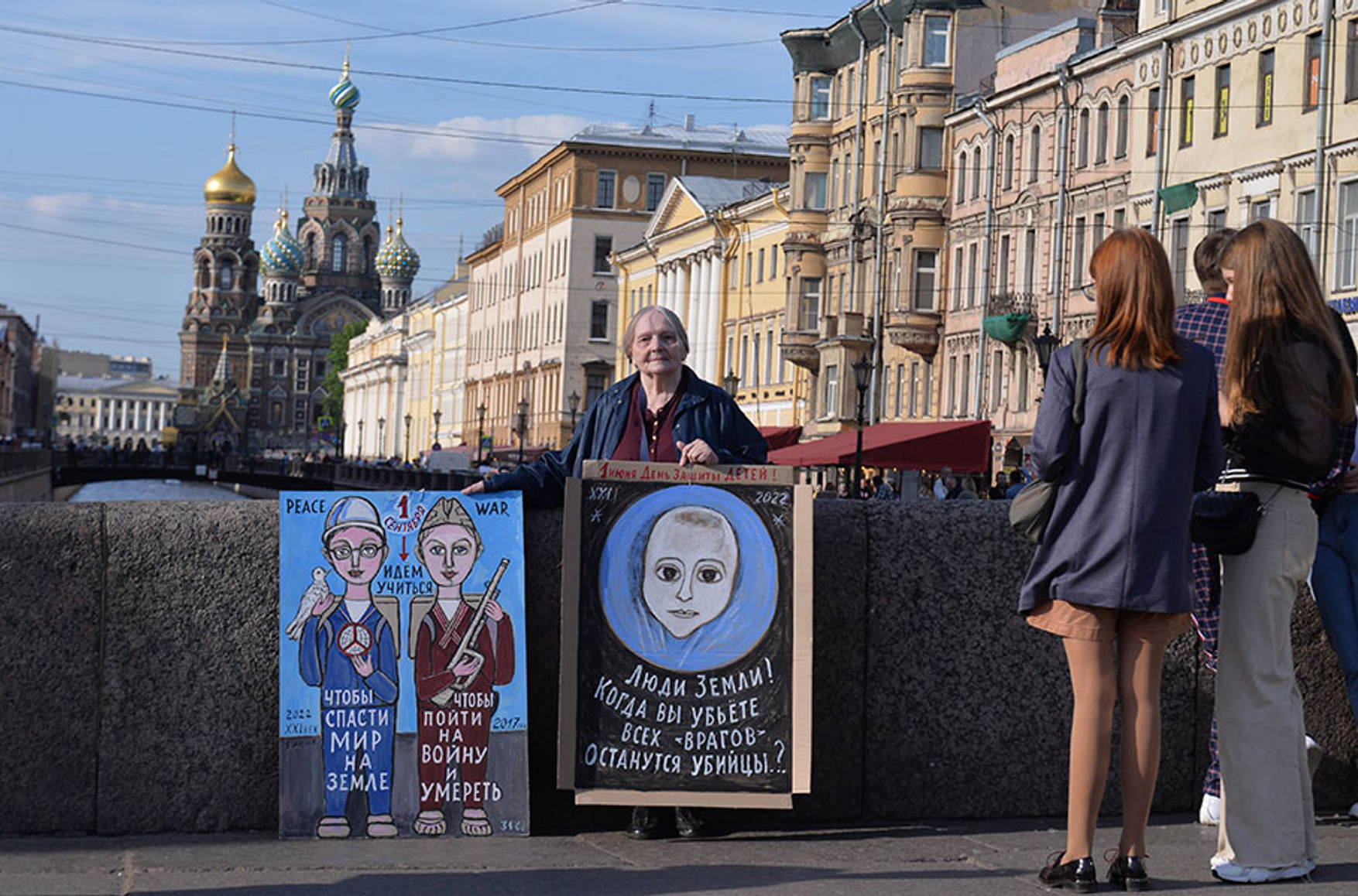 В Санкт-Петербурге художница Елена Осипова, на которую 9 мая напали неизвестные, вновь вышла на пикет со своими работами. Акция была приурочена ко Дню защиты детей, в том числе от ужасов войны.