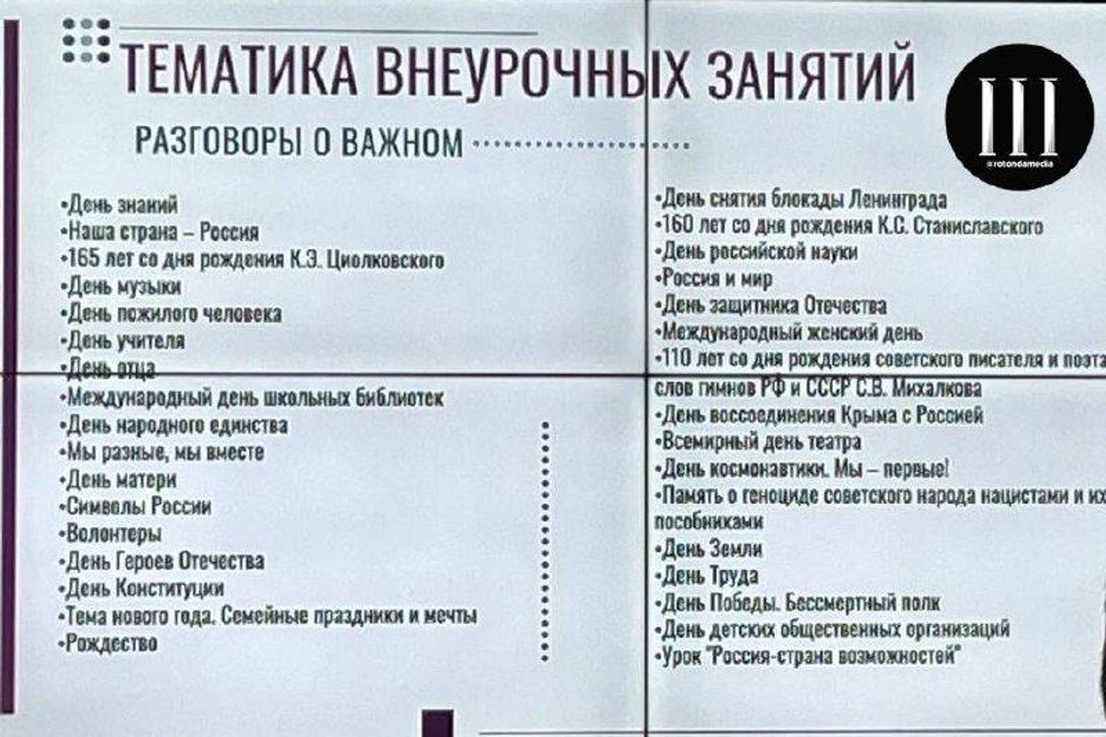 Учителей заставят проводить классные часы со школьниками с «разговорами о важном». Как пишет «Ротонда», в Петербурге в академии постдипломного образования собрали учителей для просмотра вебинара общества «Знание». Как рассказал один из участников встречи, это было занятие для классных руководителей всех регионов. Встреча была посвящена новым требованиям по классным часам, которые получат название «Говорим о важном», а среди тем таких классных часов — 110-летие автора гимнов СССР и России Сергея Михалкова, «Бессмертный полк» и «воссоединение с Крымом».