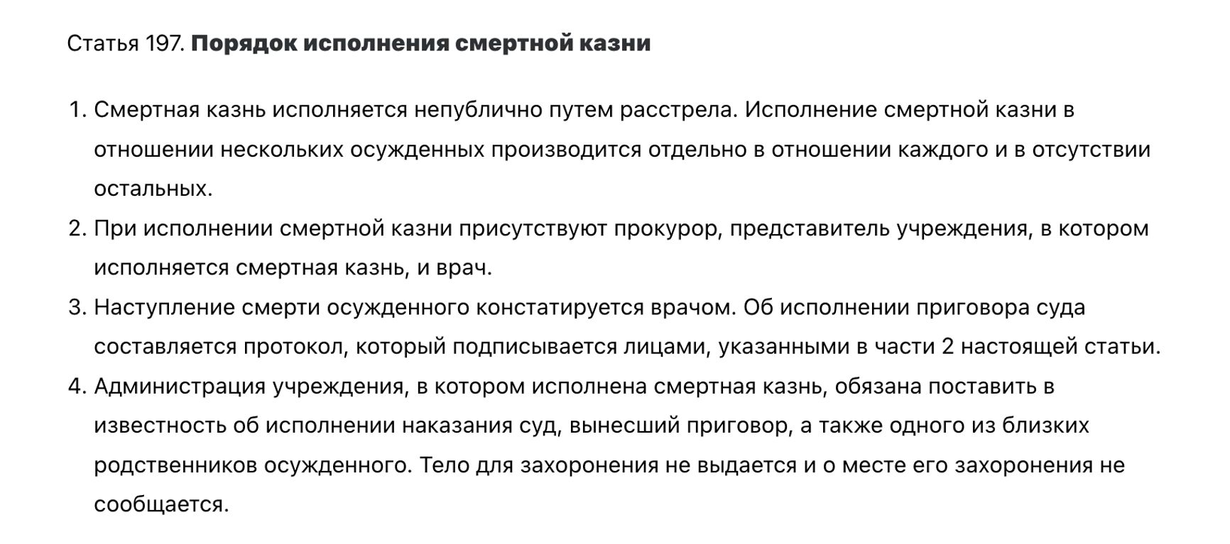 В самой статье 197 описывается порядок исполнения смертной казни, осуществляемой «непублично путем расстрела».