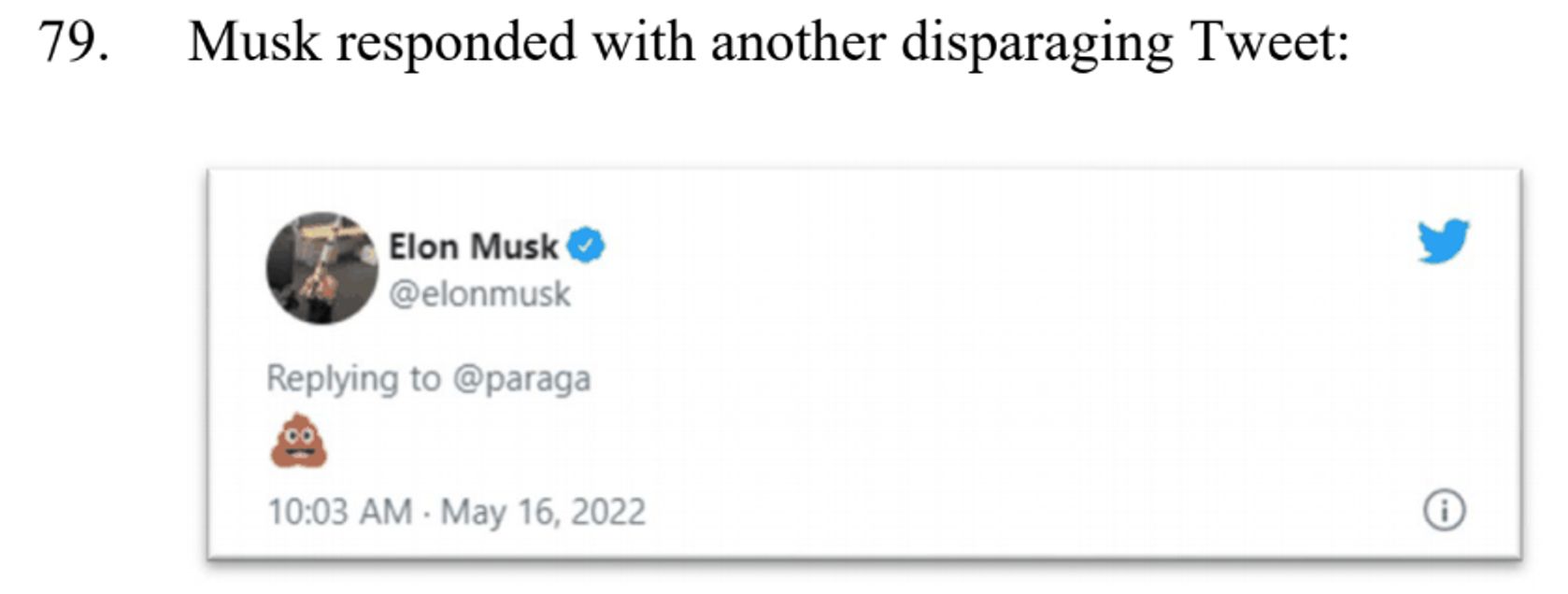 О том, что Маск вышел из сделки по приобретению Twitter, стало известно 9 июля. В письме его представителя, направленном компании, сказано, что причиной этого стало «существенное нарушение нескольких положений соглашения». В частности, Twitter не смог или отказался предоставить информацию о фейковых аккаунтах платформы. Сам Twitter утверждает, что не сделал этого, поскольку опасался, что Маск создаст конкурирующую платформу после отказа от приобретения. В иске также указывается, что 16 мая Маск ответил на твиты гендиректора соцсети Парага Агравала про усилия компании по борьбе со спам-аккаунтами, эмоджи с изображением фекалий.