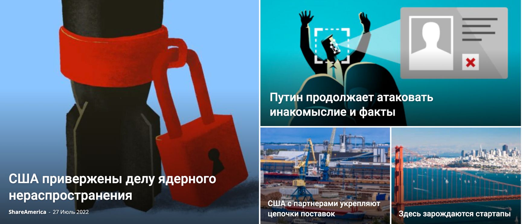 Роскомнадзор по требованию Генпрокуратуры заблокировал в России онлайн-платформу Госдепа США ShareAmerica (share.america.gov), следует из данных сервиса РКН по проверке блокировок.