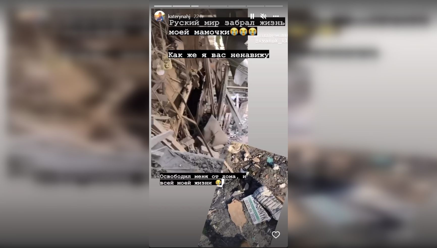 «Русский мир забрал жизнь моей мамочки. Освободил меня от дома и всей моей жизни», — написала Екатерина.