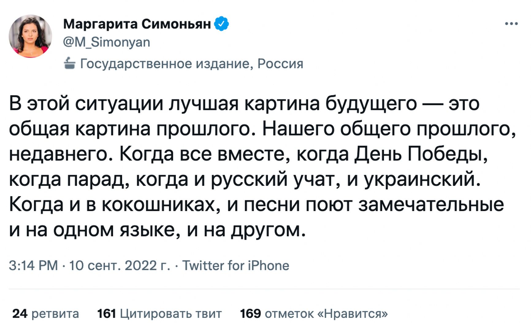 Симоньян внезапно вспомнила об «общей картине прошлого», когда народы вместе, празднуют День Победы, проводят парады, а также учат русский и украинский языки. По мнению пропагандистки, которая поддерживает с самого начала российское вторжение в Украину, другой вариант «в исторической перспективе невозможен».