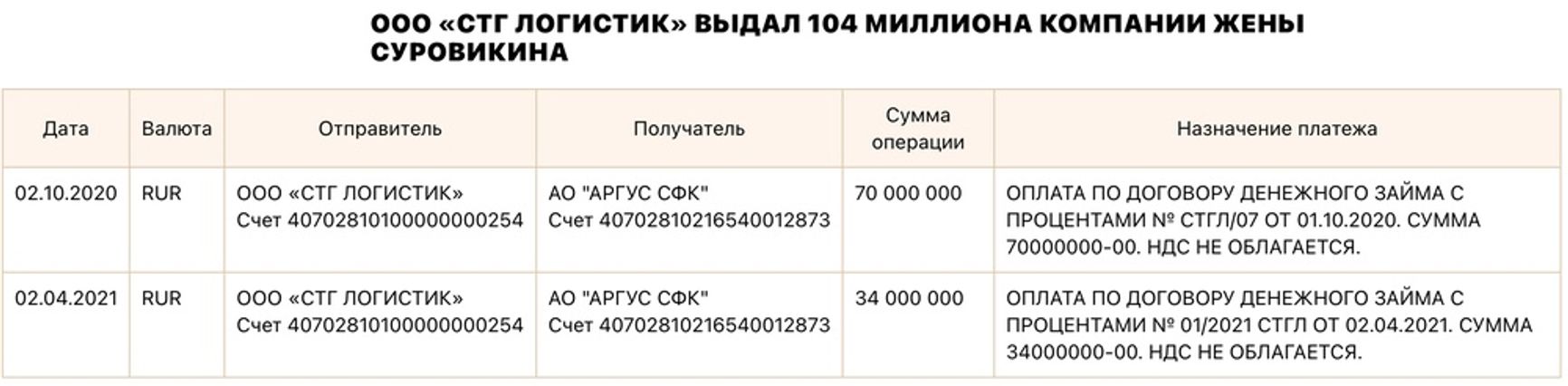 Кроме того, жена топ-менеджера «Стройтрансгаза» Михаила Хряпова выдала «Аргусу» кредит на 25 млн рублей, что авторы расследования считают платой за военные операции в Сирии, которыми руководил Суровикин.