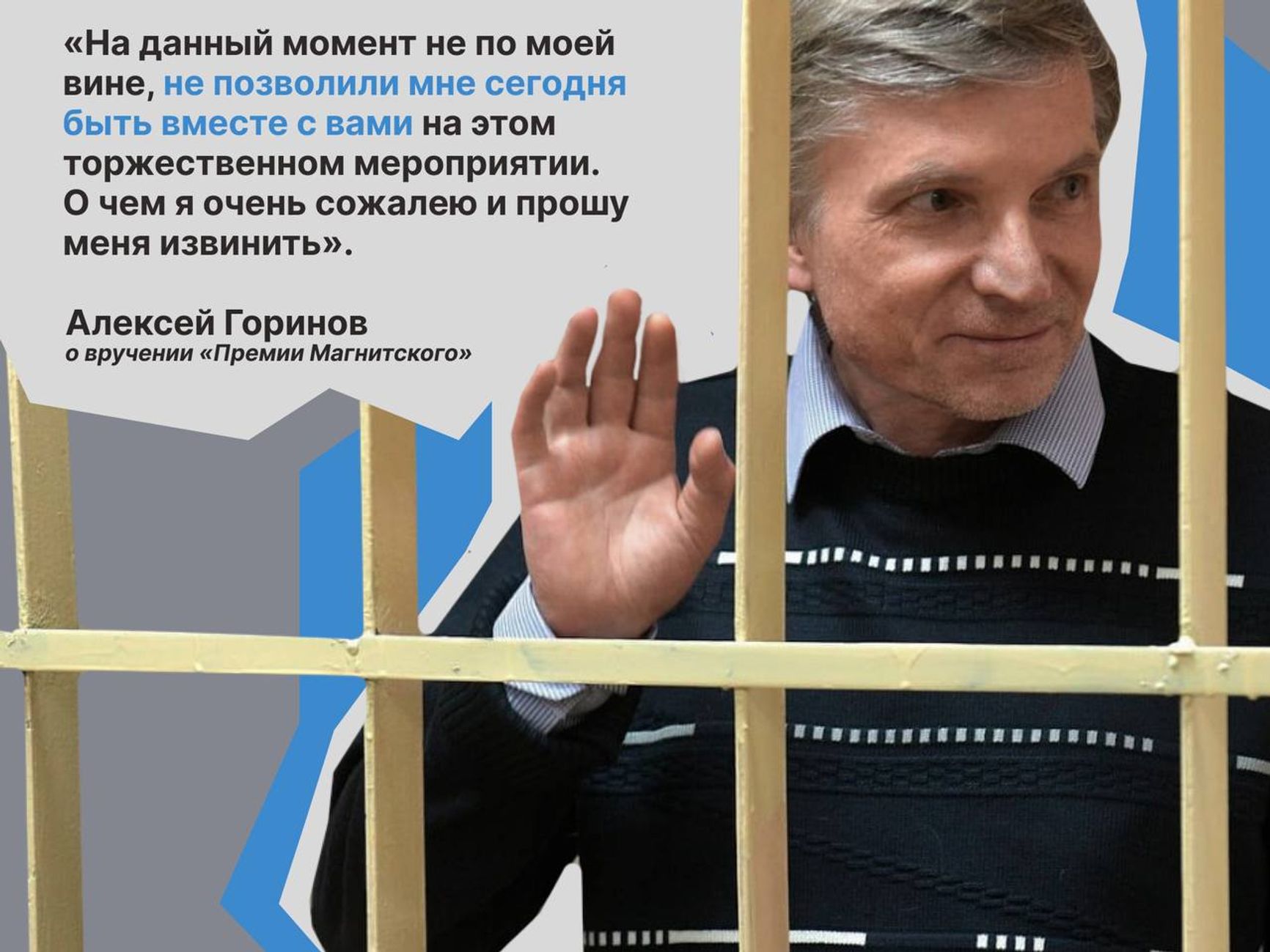 Московскому муниципальному депутату Алексею Горинову, приговоренному к 6 годам 11 месяцам лишения свободы за «фейки» про российскую армию, вручили «Премию имени Сергея Магнитского». Сообщение об этом появилось в Telegram-канале «Свободу Алексею Горинову».