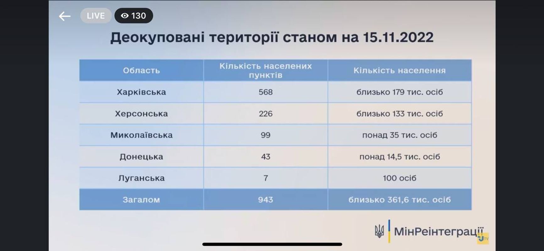 Министерство реинтеграции Украины обнародовало количество освобожденных украинских населенных пунктов по состоянию на 15 ноября. Всего освобождено 943 населенных пункта — в Харьковской, Херсонской, Николаевской, Донецкой и Луганской областях.