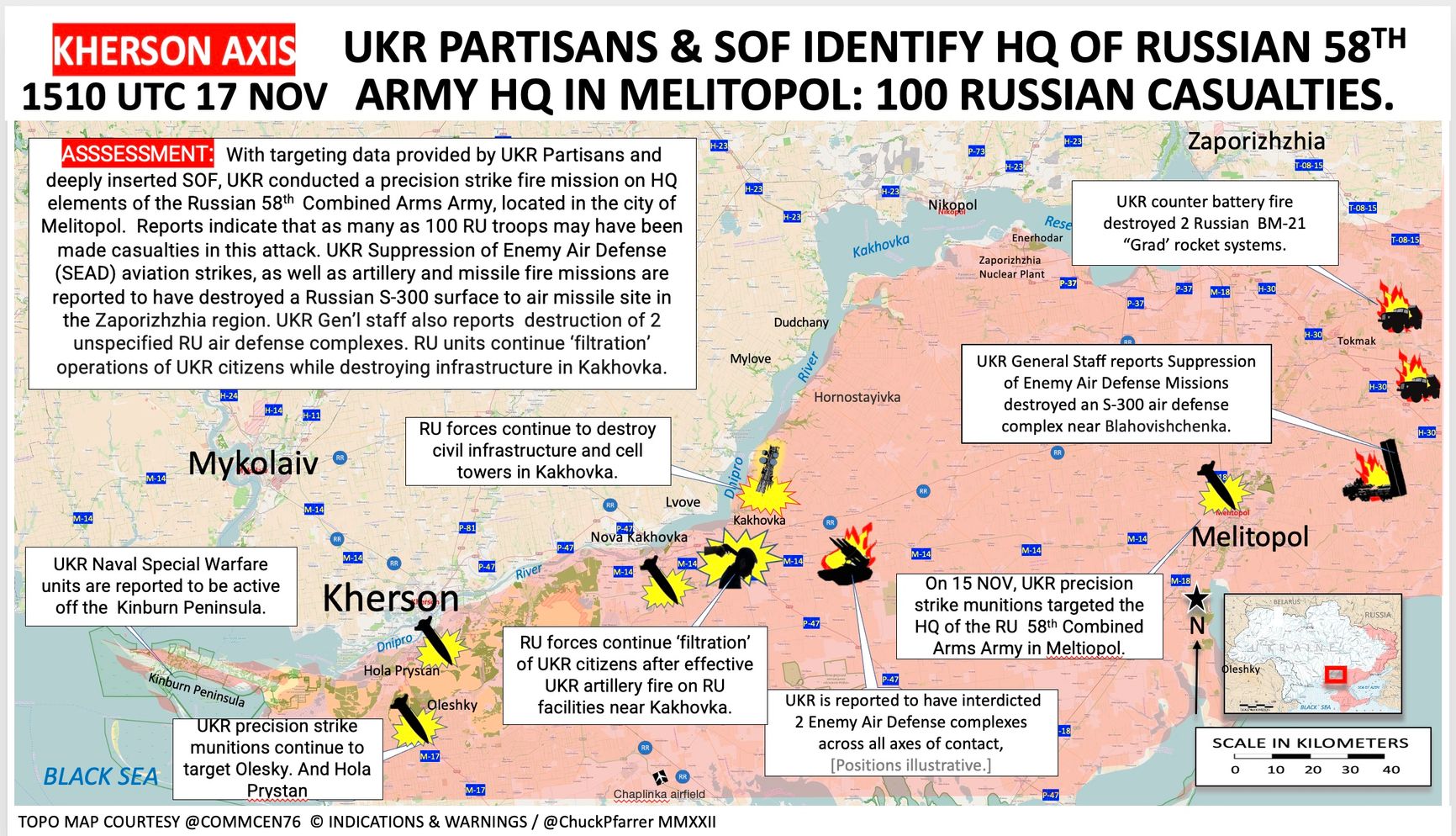 Используя координаты целей, предоставленные украинскими партизанами и глубоко внедренными Силами специальных операций, украинские военные обстреляли подразделения штаба 58-й общевойсковой армии России, расположенной в городе Мелитополь в Запорожской области, пишет в Twitter военный корреспондент, бывший военнослужащий «Морских котиков» США Чак Пфаррер. Сообщается о 100 пострадавших российских военных.
