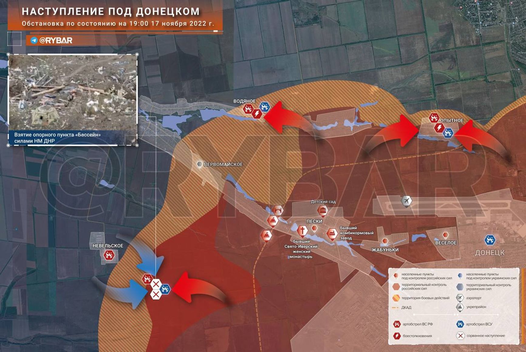 На Донецком направлении, по информации Z-каналов, российские военные из 100-й бригады НМ ДНР захватили крупный опорный пункт «Бассейн» в районе Невельского. Захват этого опорного пункта может позволить российским военным взять под огневой контроль дорогу снабжения из Красногоровки в Первомайское и Авдеевку и приступить к штурму Невельского.