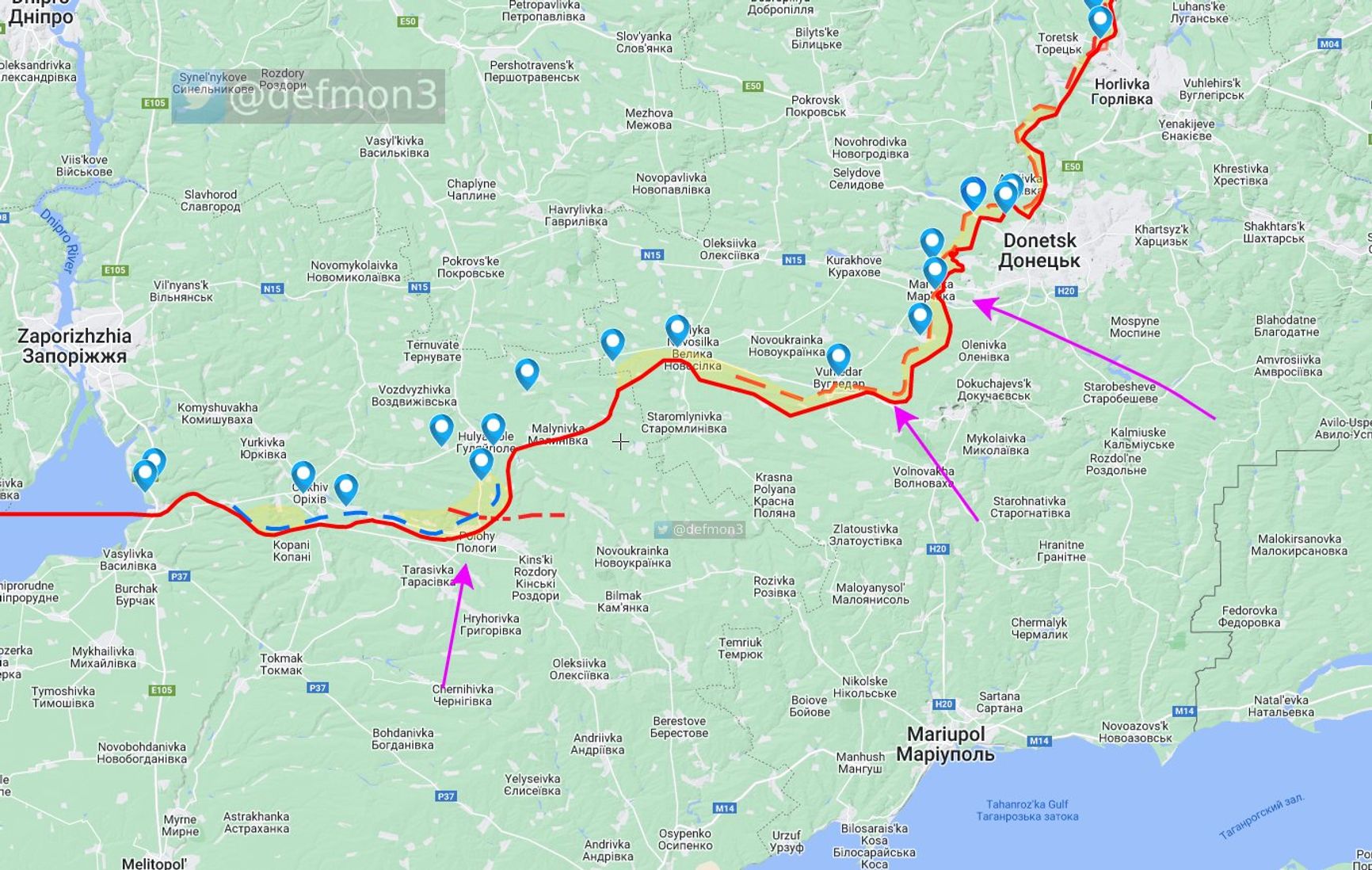 По мнению аналитика Def Mon, в ближайшее время российские силы будут накапливать потенциал для атаки по направлениям на Гуляйполе, Угледар и Марьинку. Сейчас об атаках на Донецком и Запорожском направлениях не сообщалось, эксперт считает, что россияне ждут сухой погоды.