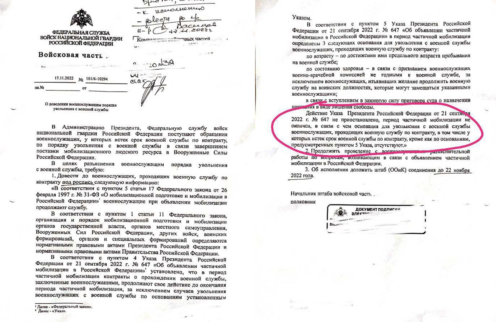 Он опубликовал письмо от Федеральной службы войск нацгвардии, в котором указано, что у тех, кто проходит службу по контракту, в том числе и тех, чей срок контракта истек, нет оснований для увольнения. Это связано с тем, что действие указа Владимира Путина о «частичной» мобилизации не приостановлено. «Военный омбудсмен» подчеркивает, что уволиться через суд в таком случае смогут только те, чей контракт закончился до 21 сентября.