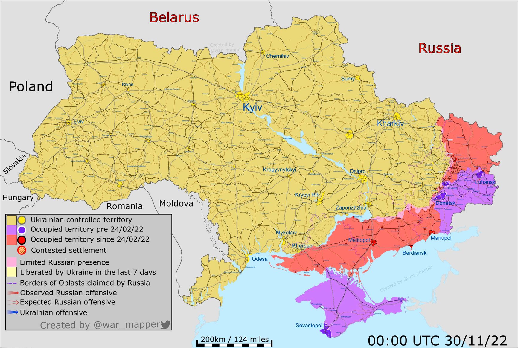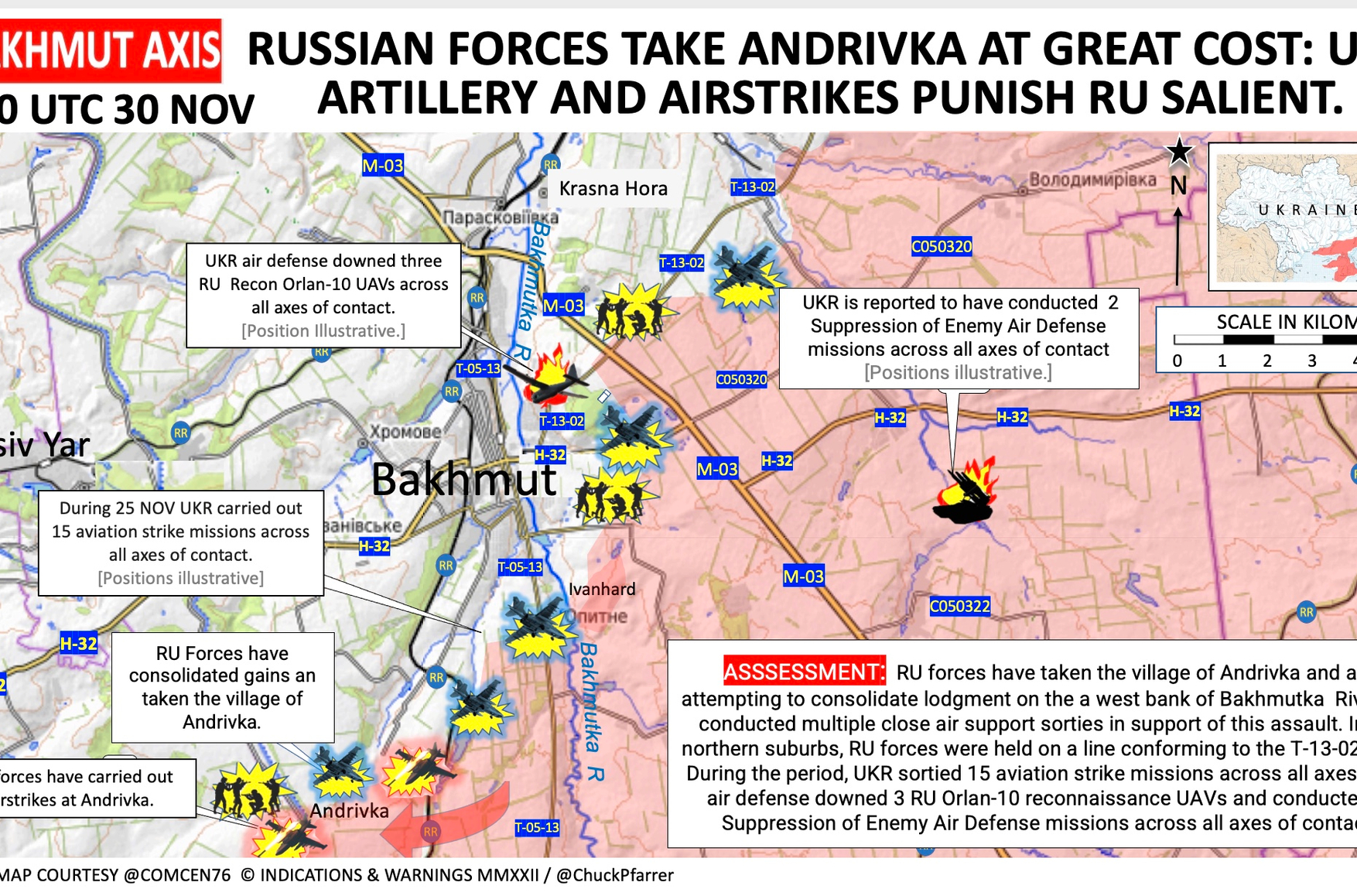 Минобороны России заявляет, что ВС РФ заняли Андреевку (к югу от Бахмута) и продолжают наступательные действия в районе населенного пункта Водяное. Согласно обновленным картам проекта War Mapper, к 30 ноября никаких заметных изменений на фронте не произошло.