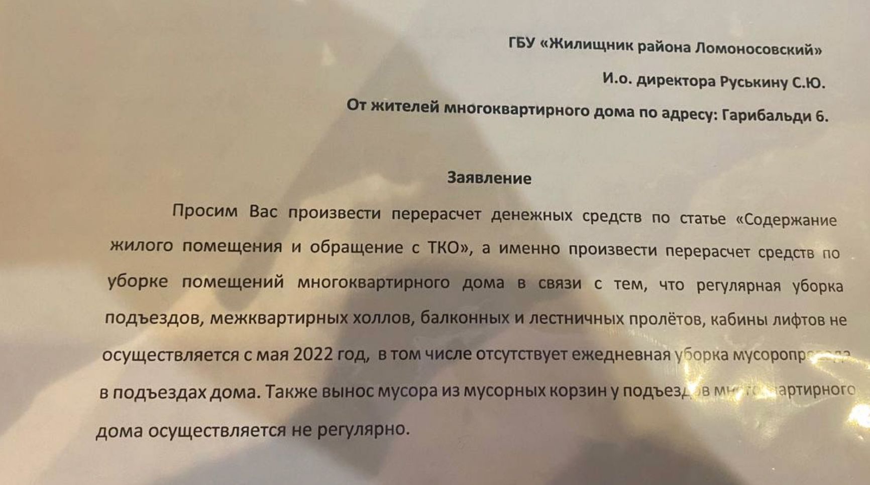 «У нас не осуществляется регулярная уборка в доме. Полы грязные, кабины лифтов грязные, пожарная лестница также грязная. Мусор не выносят ежедневно, и из-за этого мы мучаемся с регулярными засорами и тараканами. При этом все соседи регулярно платят по платежам за содержание жилого помещения и обращение с ТКО, эта сумма в месяц более 2000 рублей. Деньги ГБУ Жилищник берет, а услуги не оказывают. В управу звонили много раз, все разводят руками. Говорят: да, уборщиков нет, пишите жалобы.... Но перерасчет нам не делают, а куда-то деньги забирают и услуги не оказывают. Жалобы подавали в Мосжилинспекцию, управу, «Жилищник», в мэрию, осталось наверное только в прокуратуру написать».