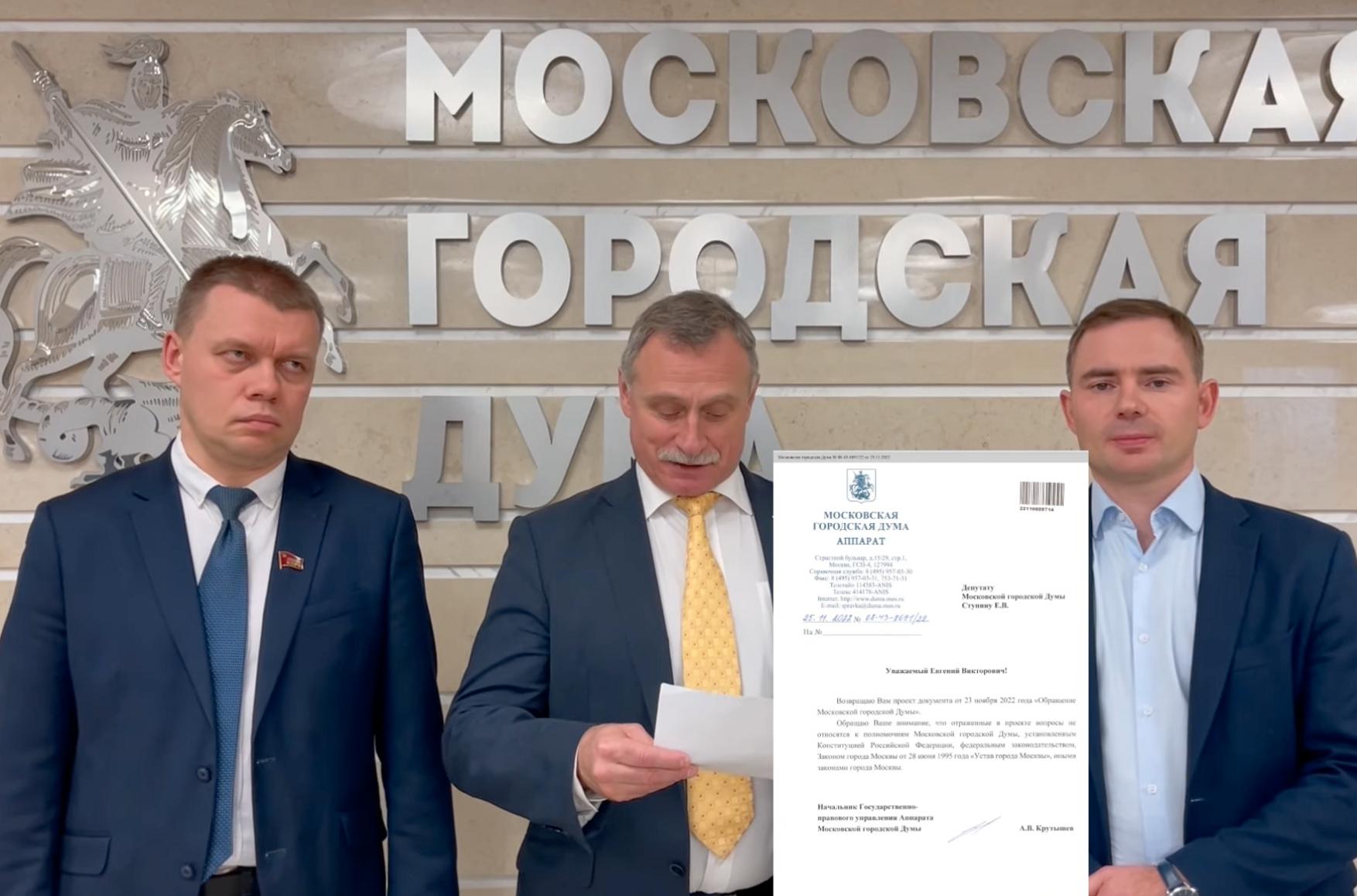 Авторам обращения заявили, что такие вопросы не входят в компетенцию городского парламента. Однако Управление не вправе ограничивать депутатов в таких обращениях. Теперь Ступин, Круглов и Тимонов направили свое обращение непосредственно Путину и продублировали его спикеру Мосгордумы.