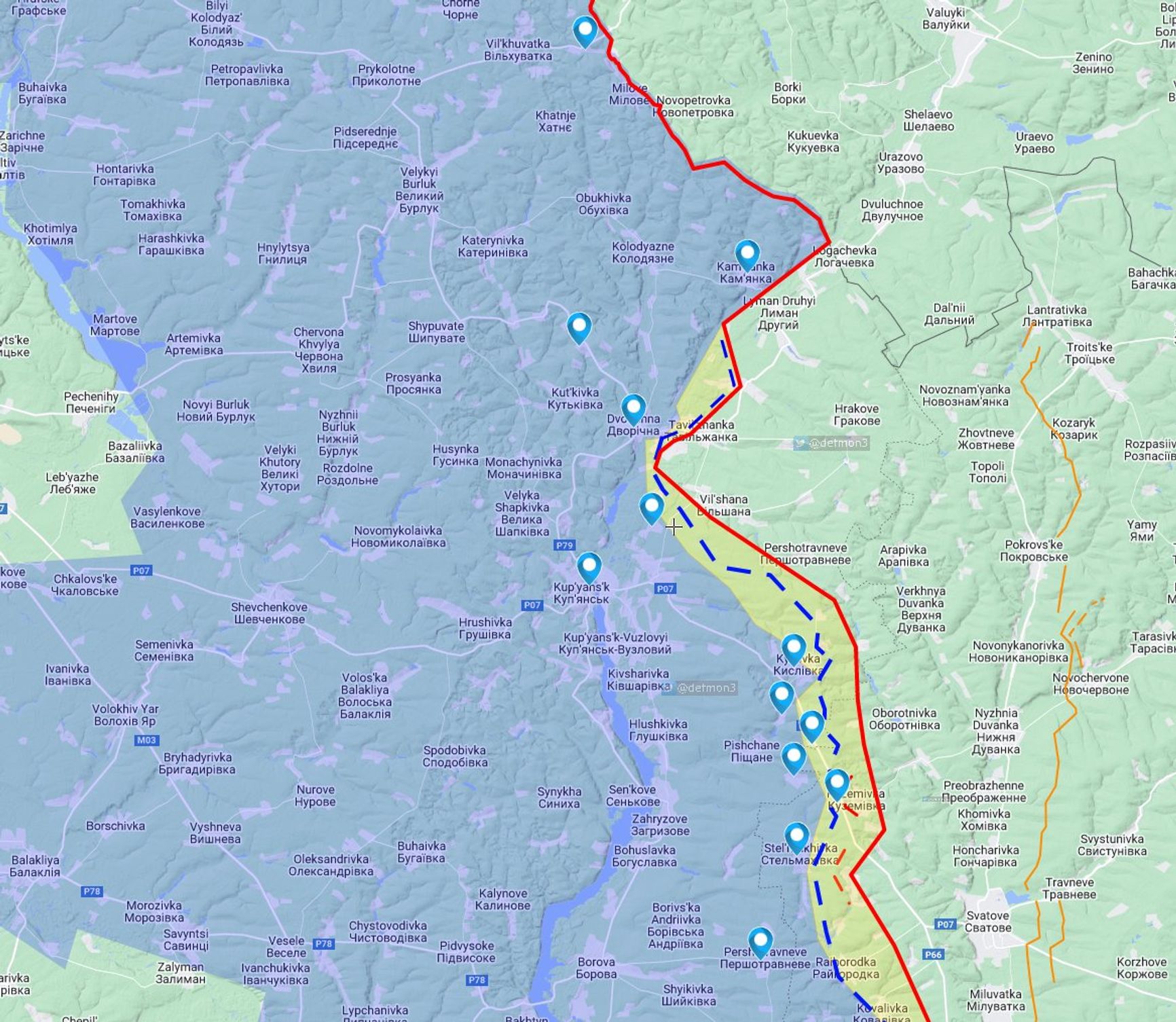 На Сватовском направлении российские силы продолжают попытки удержать районы Купянска под огневым контролем, также РФ удерживает линию вокруг поселка Ольшаны северо-восточнее Купянска, не позволяя ВСУ создать буфер вокруг своего плацдарма. Плацдарм Вооруженных сил Украины находится в зоне досягаемости российской артиллерии, подчеркивает DefMon. По его словам, это может затруднить продвижение ВСУ на этом направлении.