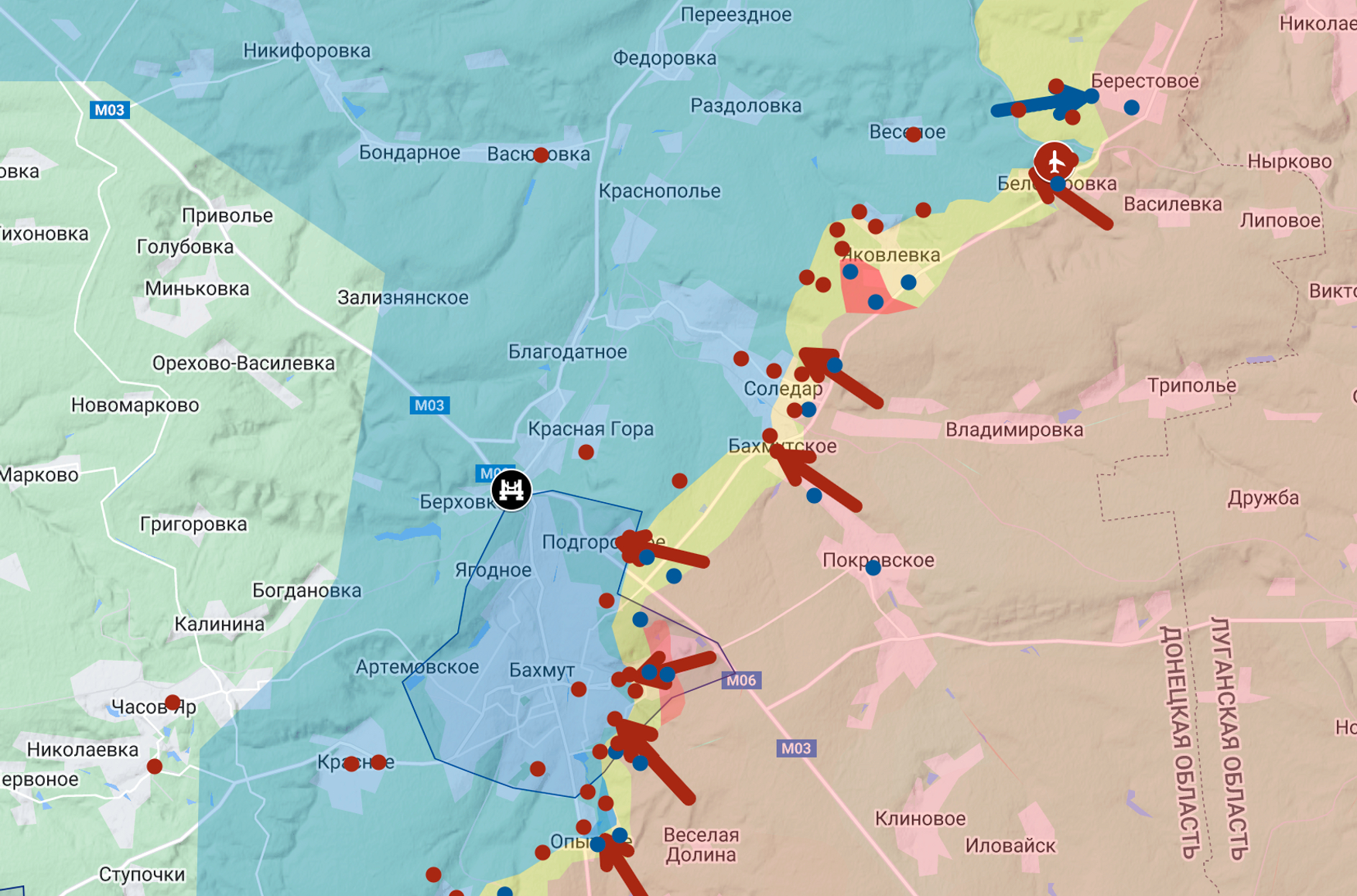 12 декабря, на 292-й день войны в Украине, продолжаются тяжелые бои в районе Бахмута Донецкой области. По данным пропагандистского проекта «Иди и смотри», ЧВК Вагнера развивают наступление на Бахмутском направлении, но город остается под контролем ВСУ. На севере Бахмута уничтожен железнодорожный мост, проходящий над трассой М-03.