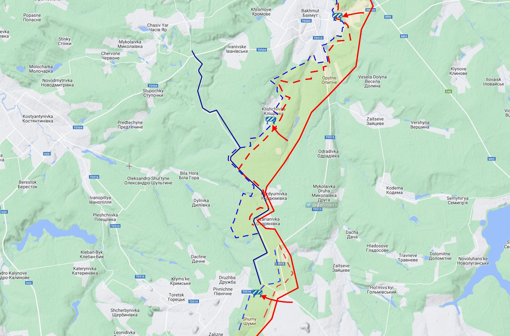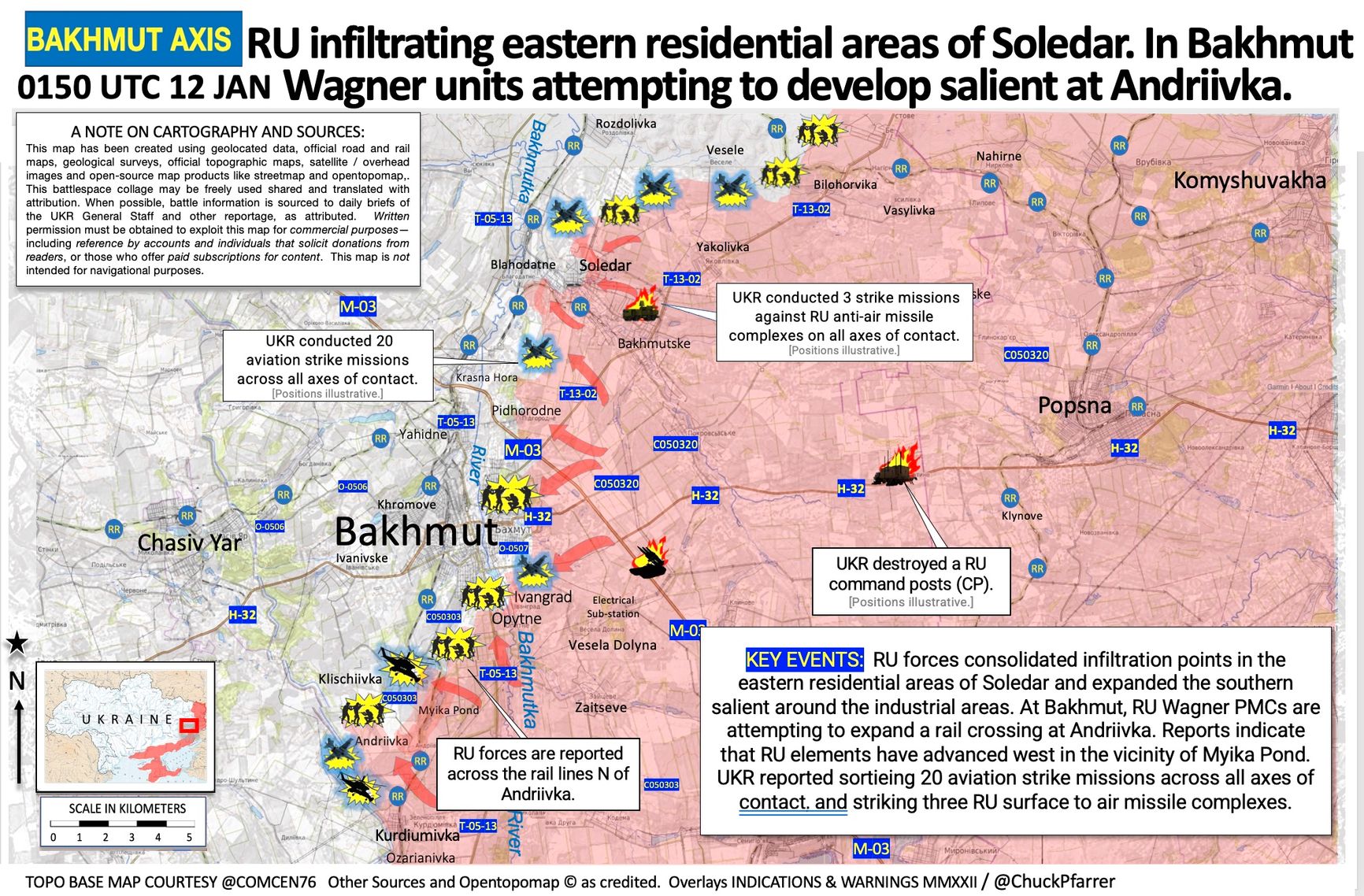 Военный корреспондент Чак Пфаррер сообщает, что российские военные увеличили присутствие в восточных жилых районах Соледара и расширили южный выступ вокруг промышленных районов. В Бахмуте, по его данным, ЧВК Вагнера перешли железную дорогу к северу от Андреевки.