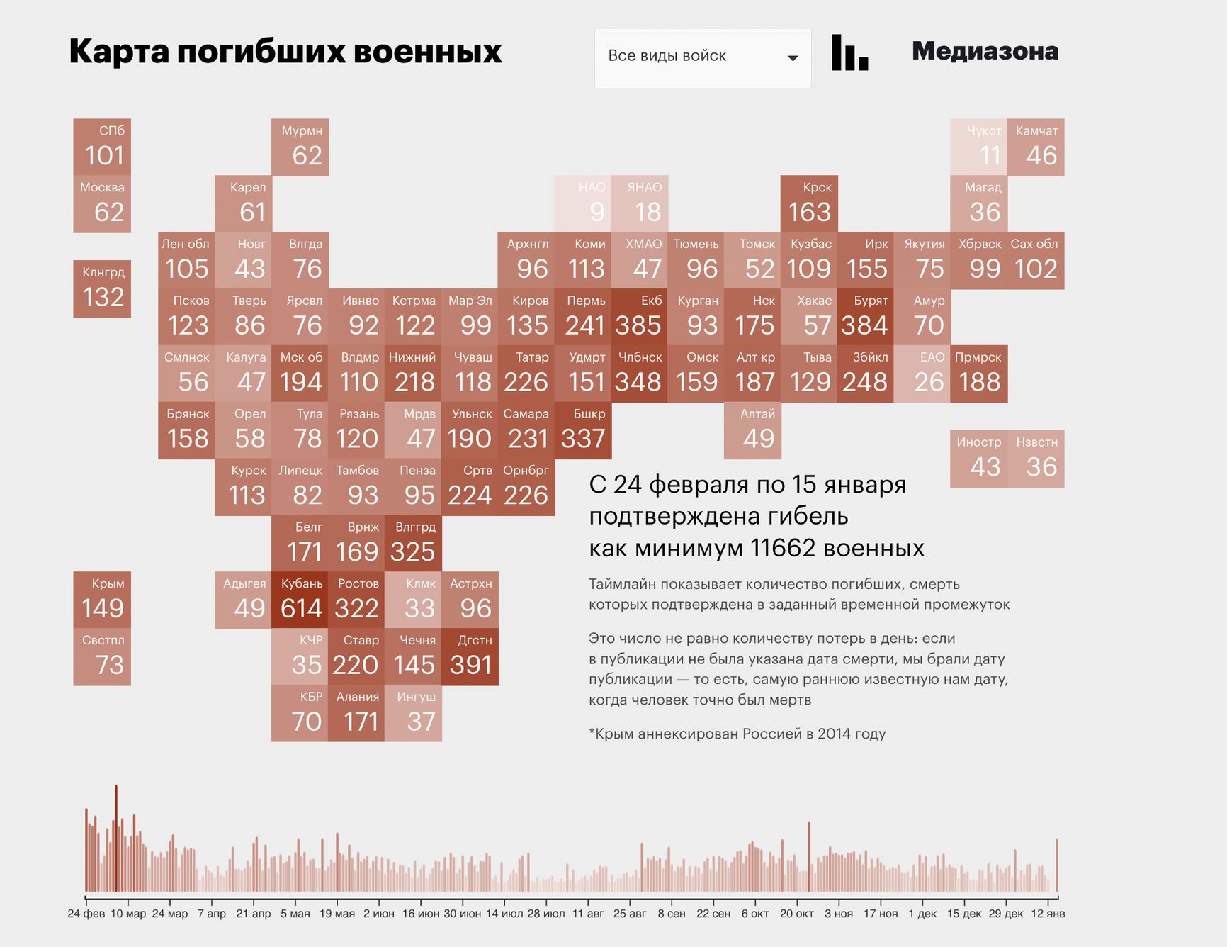 К 17 января на войне в Украине погибли 11 662 российских военнослужащих, поименную статистику ведет «Медиазона» совместно с Би-Би-Си и командой волонтеров. В списке уже более 1600 офицеров, 644 мобилизованных и около 300 завербованных заключенных.