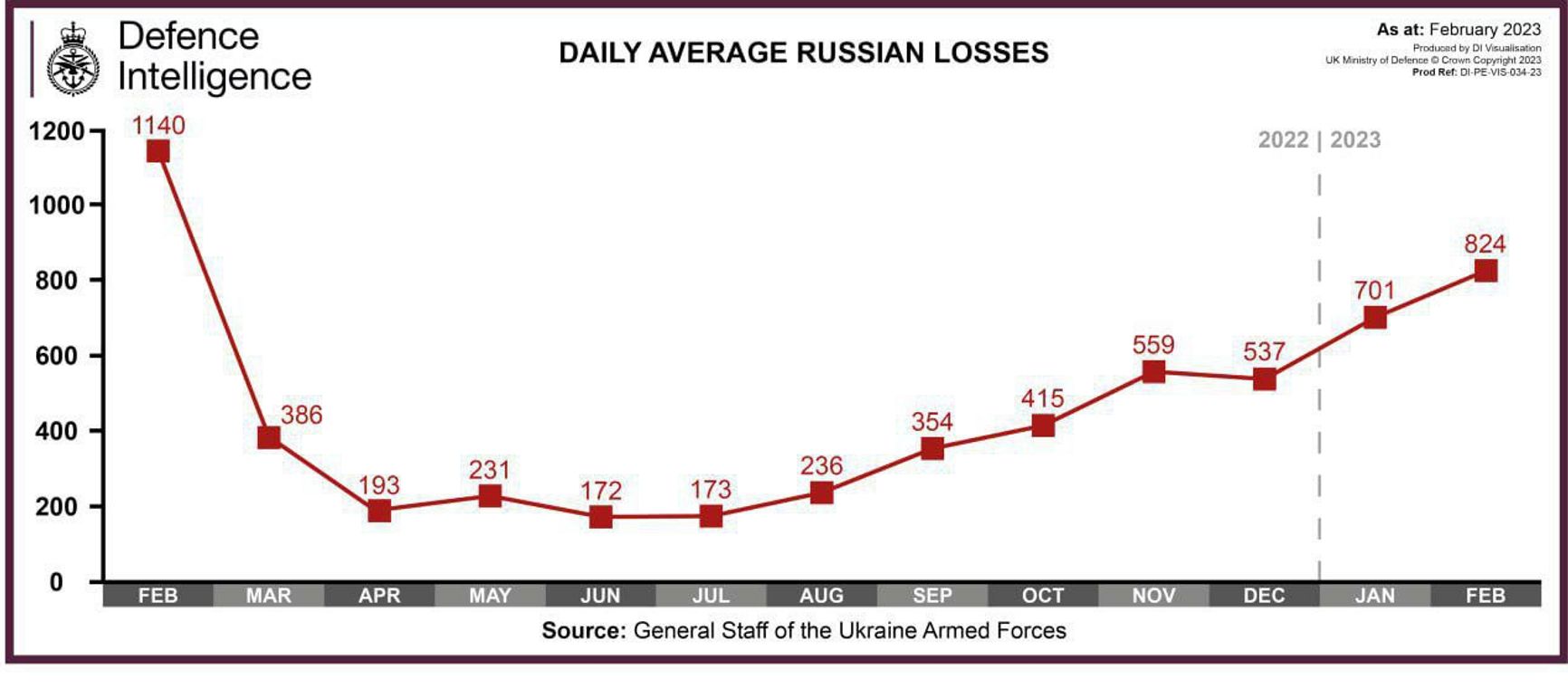 По данным украинского Генштаба, в течение последней недели потери России составляют в среднем 824 человека в сутки. Это более чем в четыре раза превышает потери, которые российская армия несла в июне-июле. По статистике Генштаба ВСУ, опубликованной 12 февраля, общие российские потери с начала вторжения составили около 137780 человек.