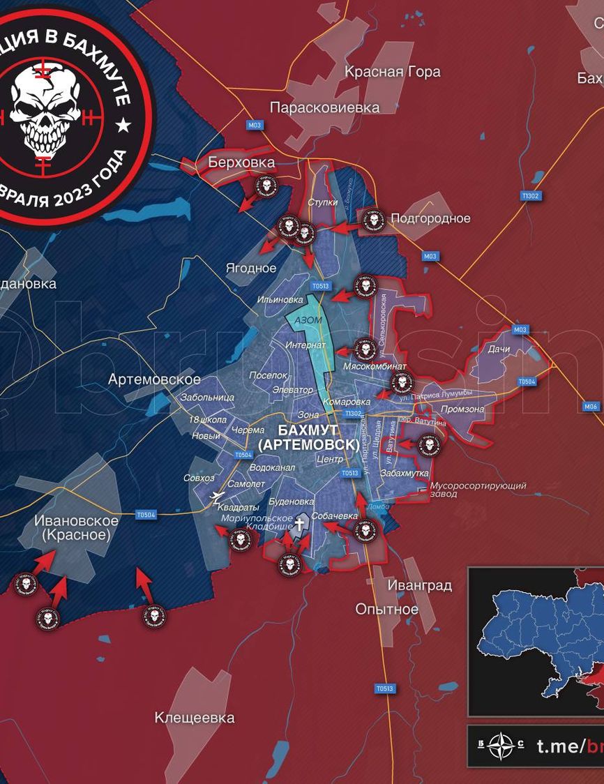 К югу от Бахмута ВСУ обстреляли Озаряновку, передает War Gonzo. К северу от города ЧВК Вагнера штурмуют Ягодное. Также они продвигаются к Дубово-Васильевке и Орехово-Васильевке. Таким образом, сейчас основное давление на украинский гарнизон в Бахмуте идет с севера.