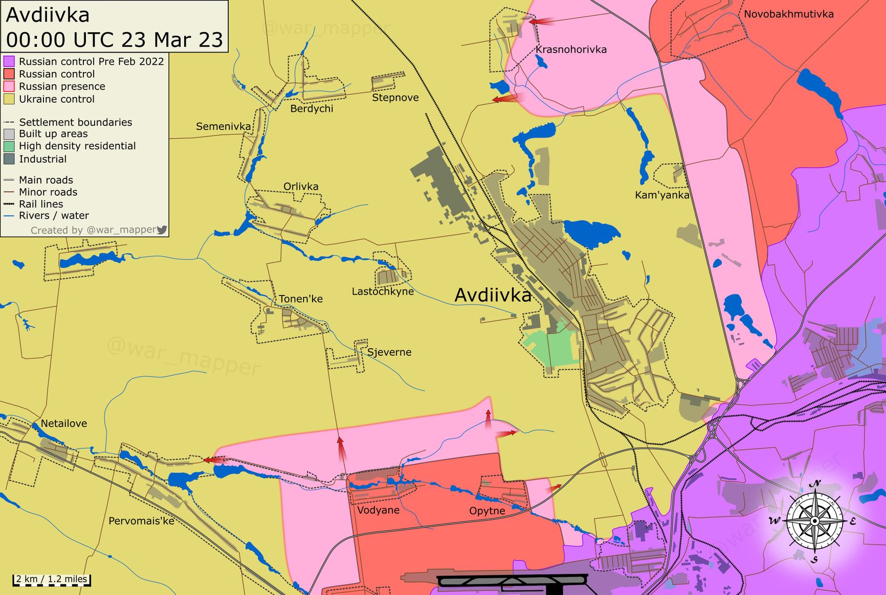 Эксперт пропагандистского «Центра военно-политической журналистики» Борис Рожин написал в Telegram-канале, что ситуация к северу от Авдеевки изменилась. По его словам, никакого оперативного окружения и, тем более, котла там сейчас нет, дороги через Орловку продолжают активно использоваться ВСУ. Организовать серьезный нажим на Тоненькое со стороны Первомайского и Водяного, по мнению Рожина, на текущий момент не получается. При этом продвижение у Красногоровки создает угрозу выхода к Орловке с северо-востока, поэтому украинские военнослужащие сейчас укрепляет оборону к западу от Красногоровки.