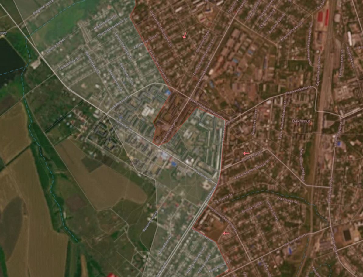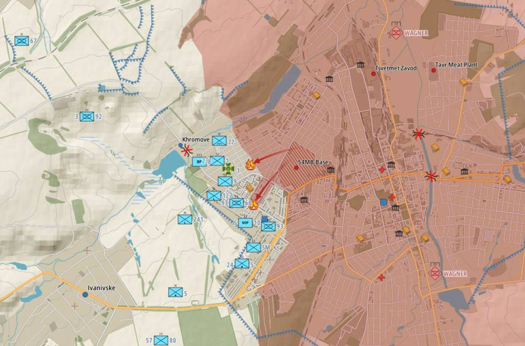 В самом городе DeepState геолоцировал артиллерийское поражение сил ЧВК Вагнера в одном из зданий на западной окраине. Карта ресурса показывает значительное продвижение вагнеровцев в городской застройке.