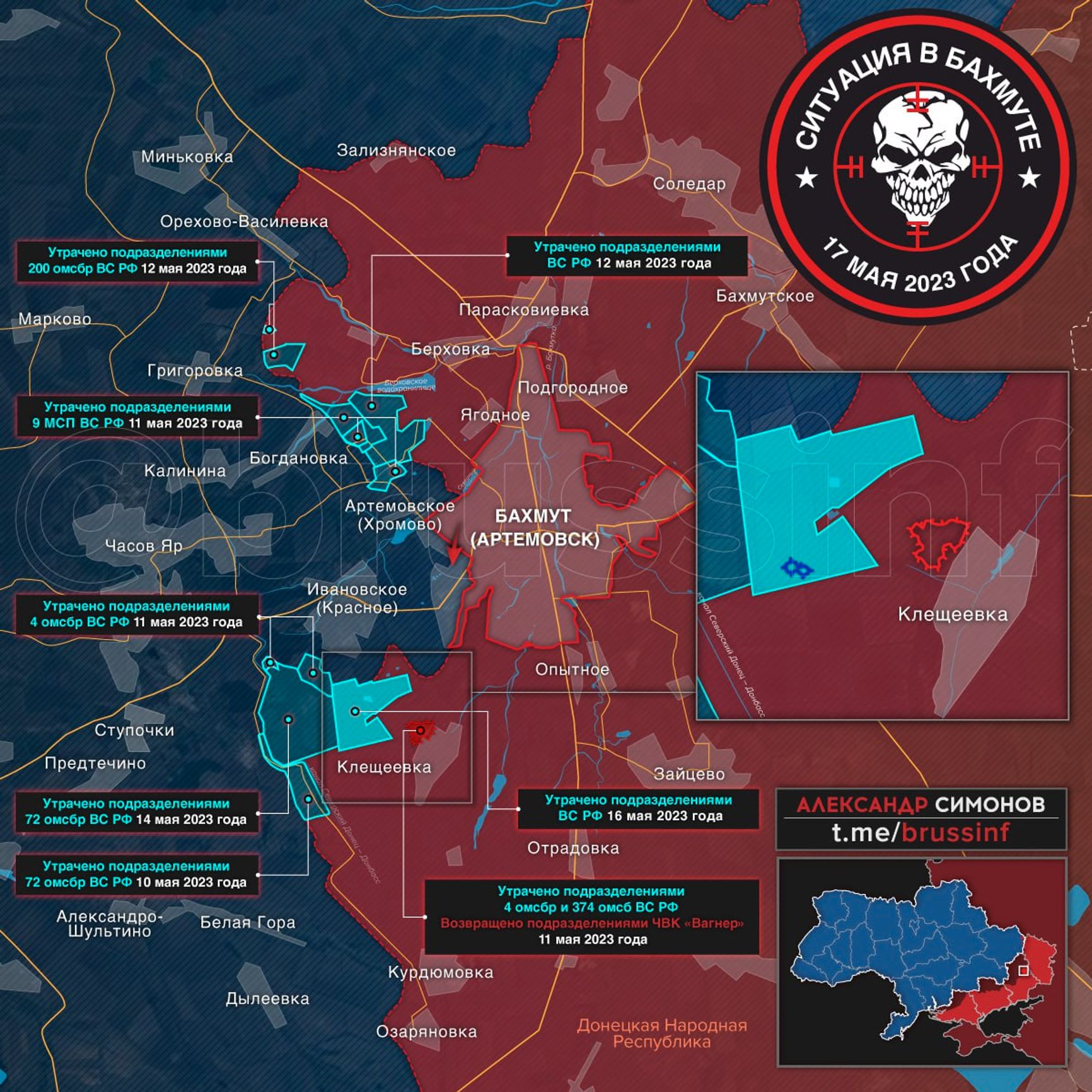 О главных событиях войны 16 мая — в предыдущей сводке: «ЧВК Вагнера наступает в Бахмуте, над Украиной сбили шесть “Кинжалов”, Минобороны РФ “поразило” ЗРК Patriot. Что происходит на линии фронта».