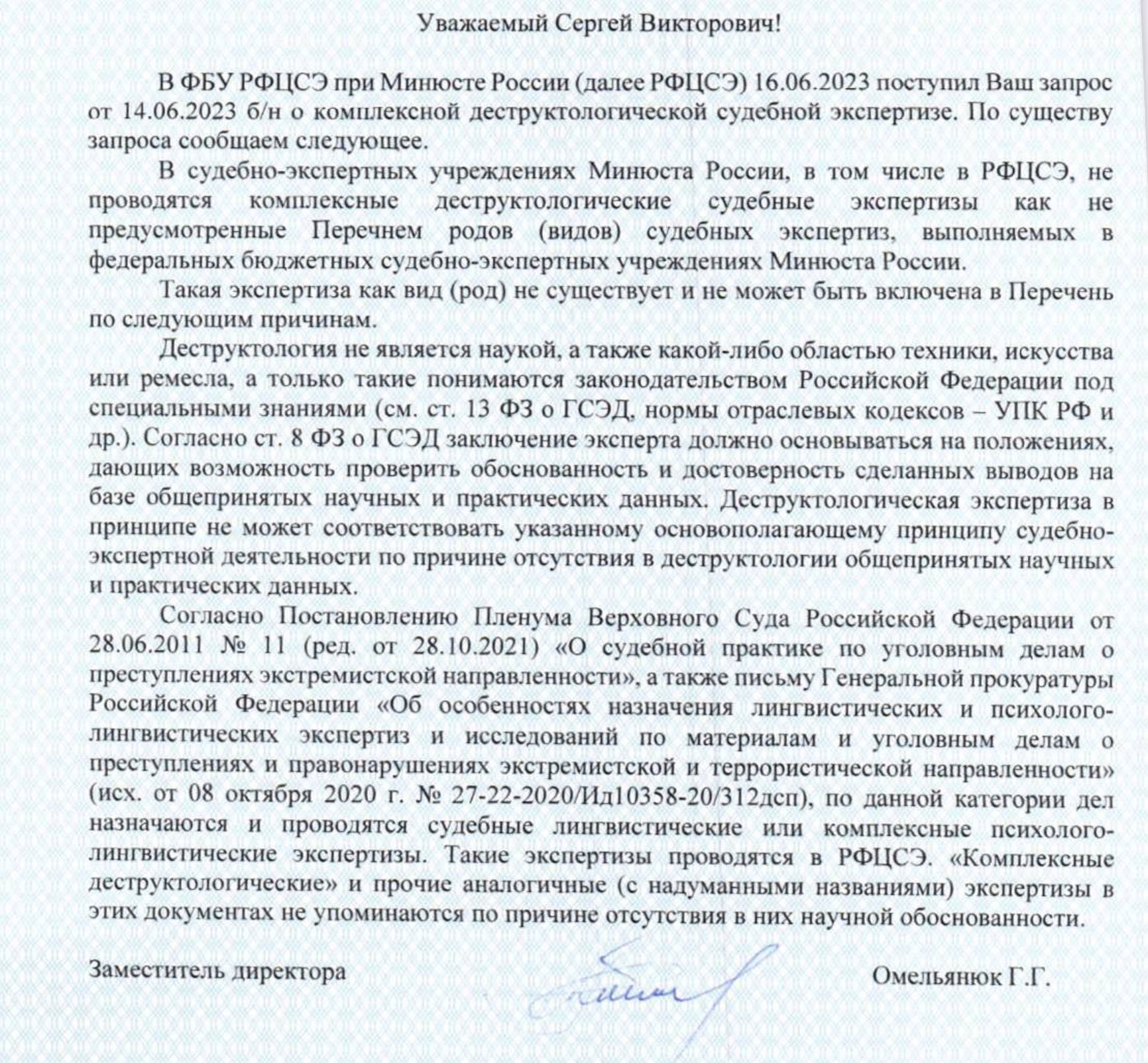 «Такая экспертиза как вид (род) не существует и не может быть включена в перечень», — заявили в Российском федеральном центре судебной экспертизы при Минюсте. Там также подчеркнули, что деструктология не является наукой, областью техники, искусства или ремесла. Ответ Центра был опубликован адвокатом Беркович: