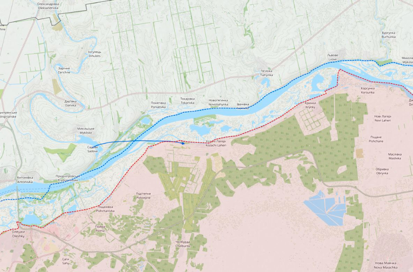 Российские «военкоры» (1, 2, 3) пишут, что на самом деле подразделения ВСУ высадились и закрепились на окраинах населенного пункта, создав условия для наведения переправы для техники. Отмечается, что после переброски частей ВДВ с этого участка на запорожское направление на первой линии обороны разместили мобилизованных.