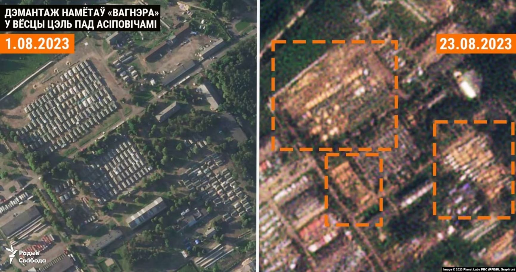 Между тем, судя по спутниковым снимкам, начался демонтаж лагеря ЧВК Вагнера в Беларуси. Всего с 1 августа убрали 101 палатку из 237, значит, примерно две тысячи вагнеровцев убыли с этого места дислокации. С другой стороны, проект «Беларускі Гаюн» пишет, что специальных вывозных рейсов в Африку или Россию для наемников не фиксировалось.