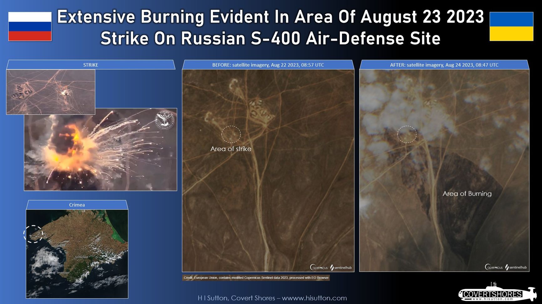 Исследователь H. I. Sutton публикует спутниковый снимок последствий упоминавшегося выше удара по позиционному району ПВО на мысе Тарханкут в Крыму, где видны последствия сильного пожара.