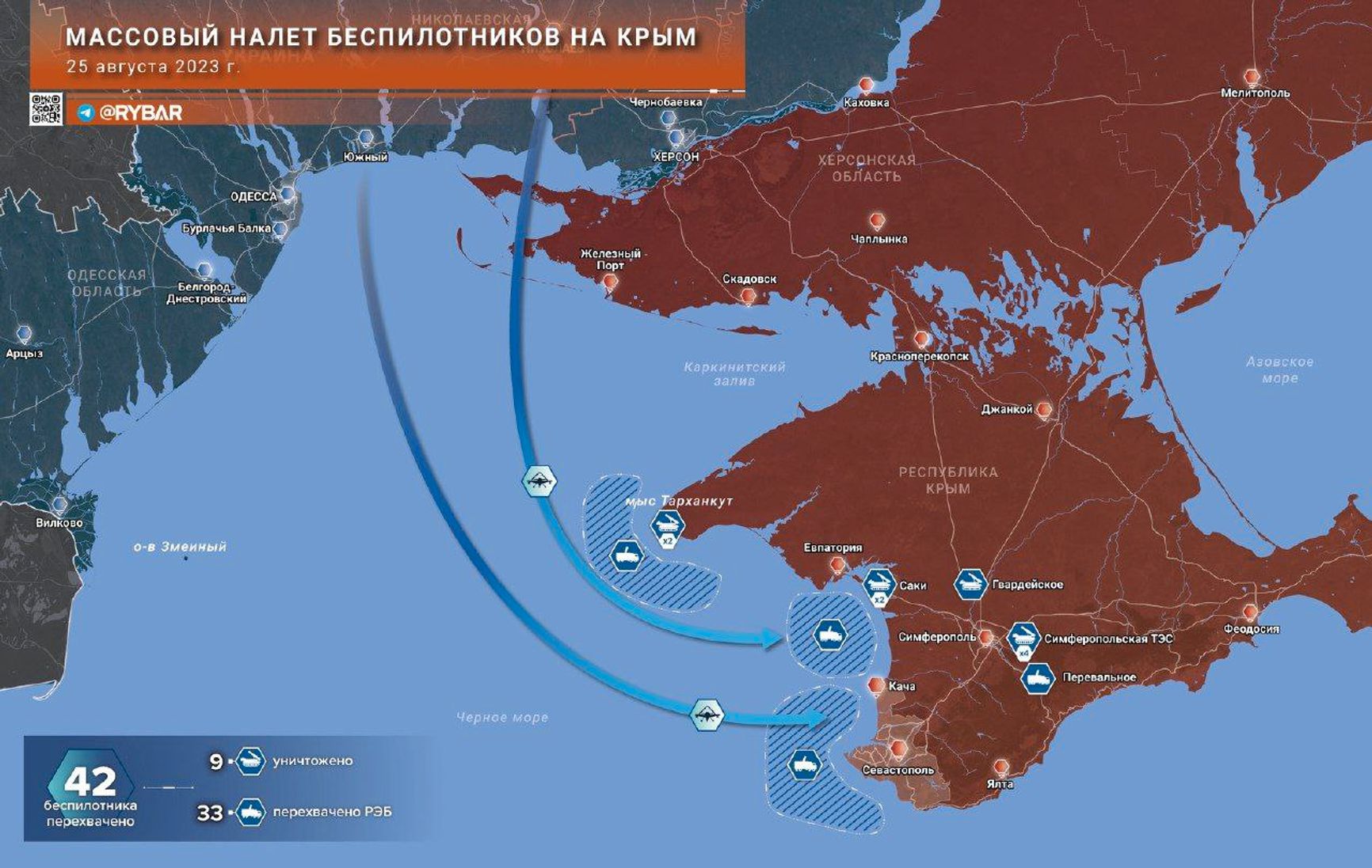 Запущенные дроны Mugin-5 PRO, атаковавшие полуостров, вылетели, по этим данным, с аэродрома Долгинцево под Кривым Рогом и из окрестностей Южного в Одесской области, и следовали, огибая мыс Тарханкут с запада. Это самый массовый налет беспилотников на Крым за последние месяцы. В Z-каналах публикуют фотографии обломков и целых дронов, посаженных с помощью РЭБ.