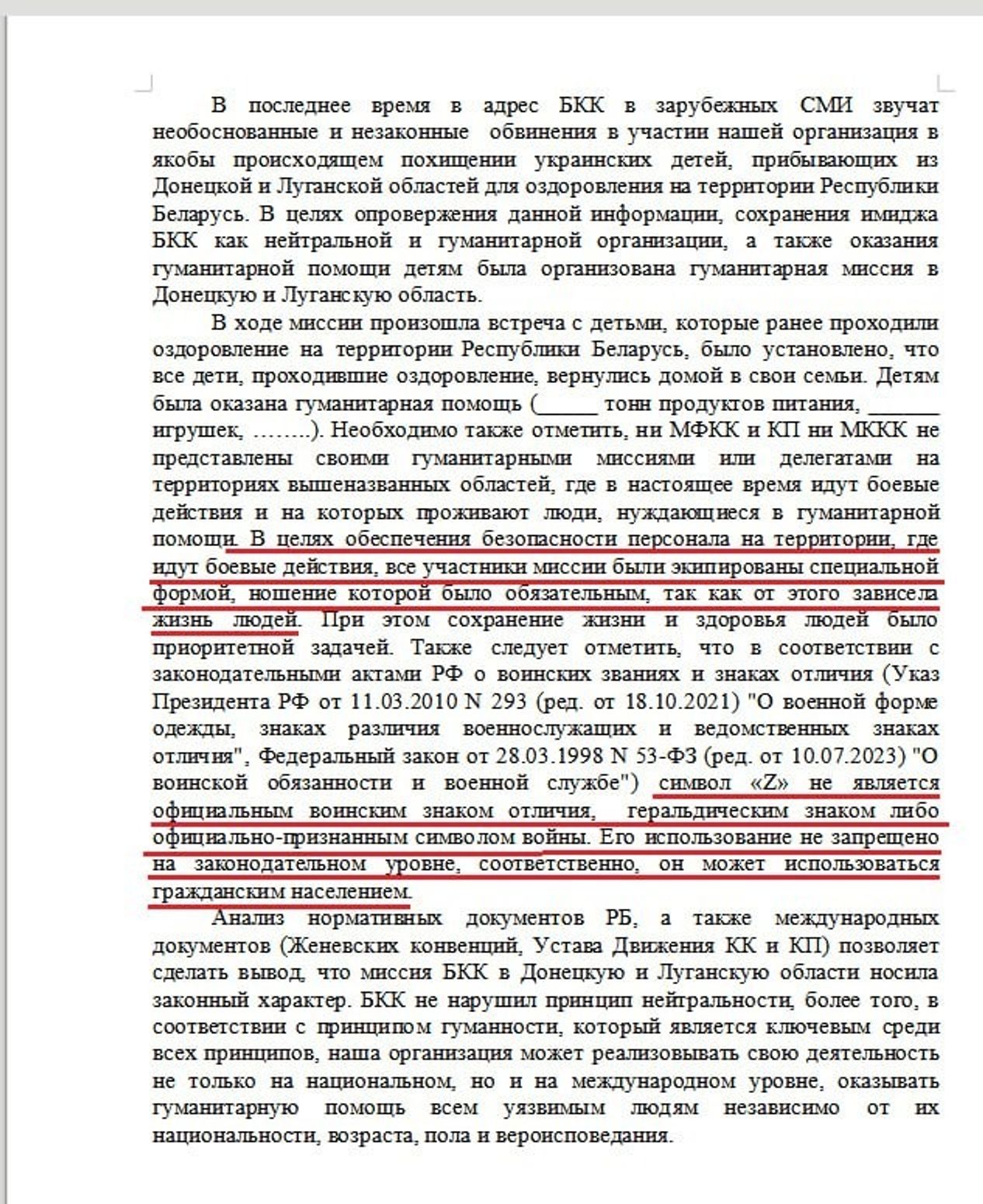В одном из ответов, например, сказано, что детей из Украины никто не похищал, те находились в республике «на оздоровлении». Кроме того, «символ Z не является официальным воинским знаком отличия, геральдическим знаком либо официально признанным символом войны. Его использование не запрещено на законодательном уровне, соответственно, он может использоваться гражданским населением».