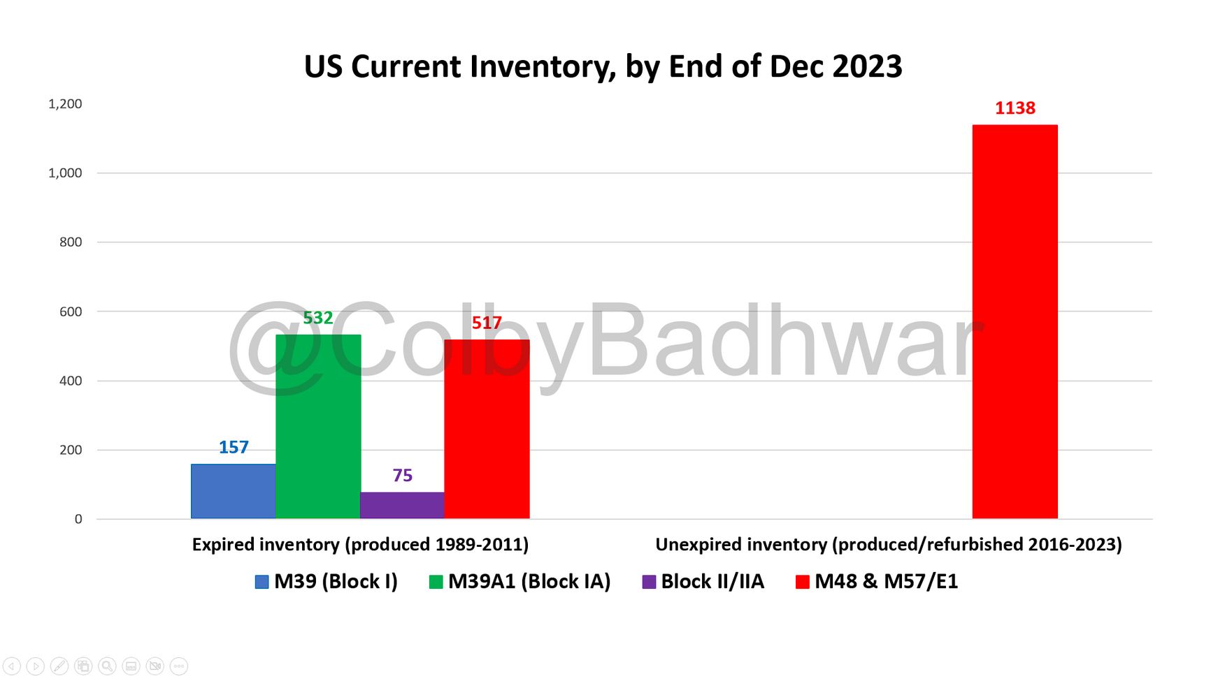 Бадхвар также показывает, что сейчас на складах Пентагона не так уж и мало ракет этого семейства (ранее утверждалось, что их слишком мало и они необходимы для поддержания обороноспособности США): 1138 единиц в боеготовом состоянии и около 1300 с истекшими гарантийными сроками, которые можно либо отдать на утилизацию, либо после обслуживания передать ВСУ. Из этого делается вывод, что передача ВСУ ATACMS зависит исключительно от политической воли.