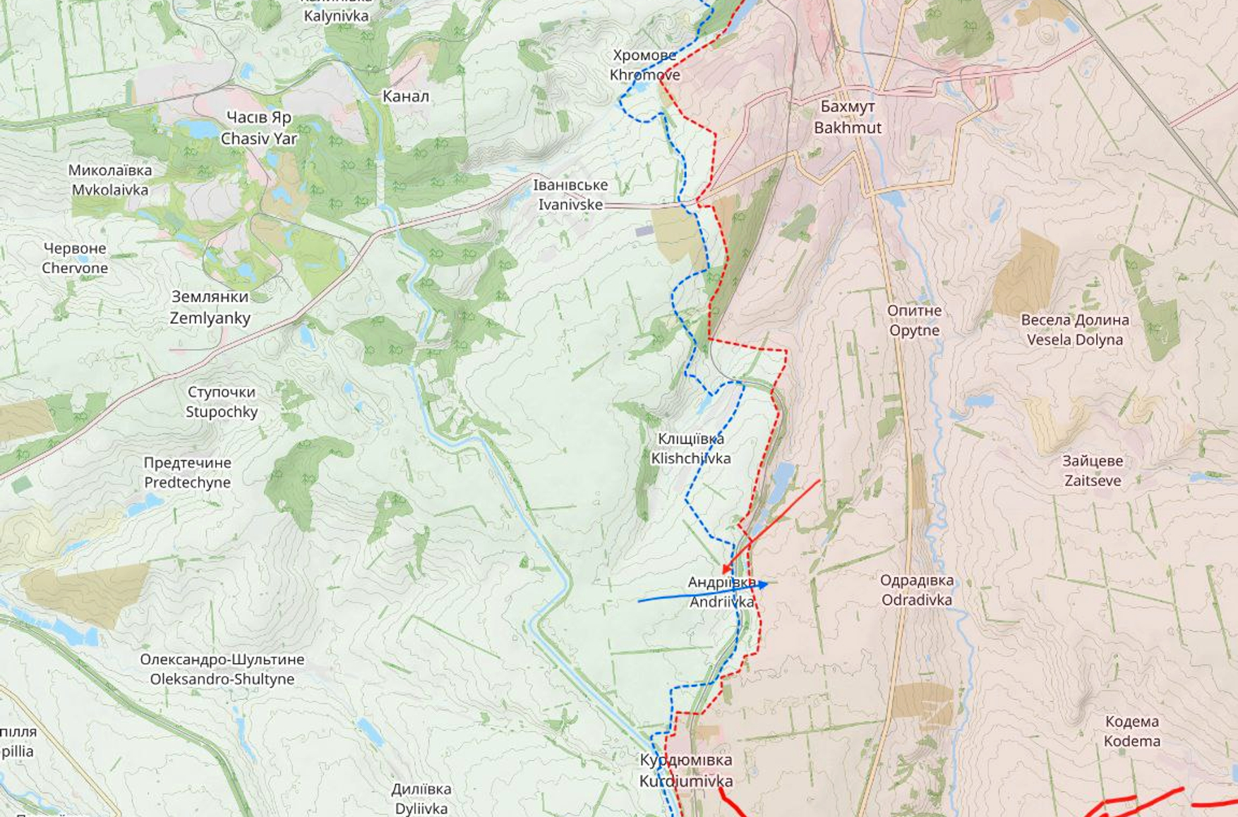 Тем временем украинский OSINT-проект DeepState приводит слова начальника пресс-службы Восточной группировки ВСУ Ильи Евлаша, который рассказывает о тяжелых боях у железной дороги за Клещеевкой. По его словам, участок фронта находится под постоянными обстрелами, как и трасса Бахмут — Горловка, один из путей снабжения российской группировки в Бахмуте. Авторы проекта утверждают, что заявления Евлаша соответствуют реальному состоянию дел.