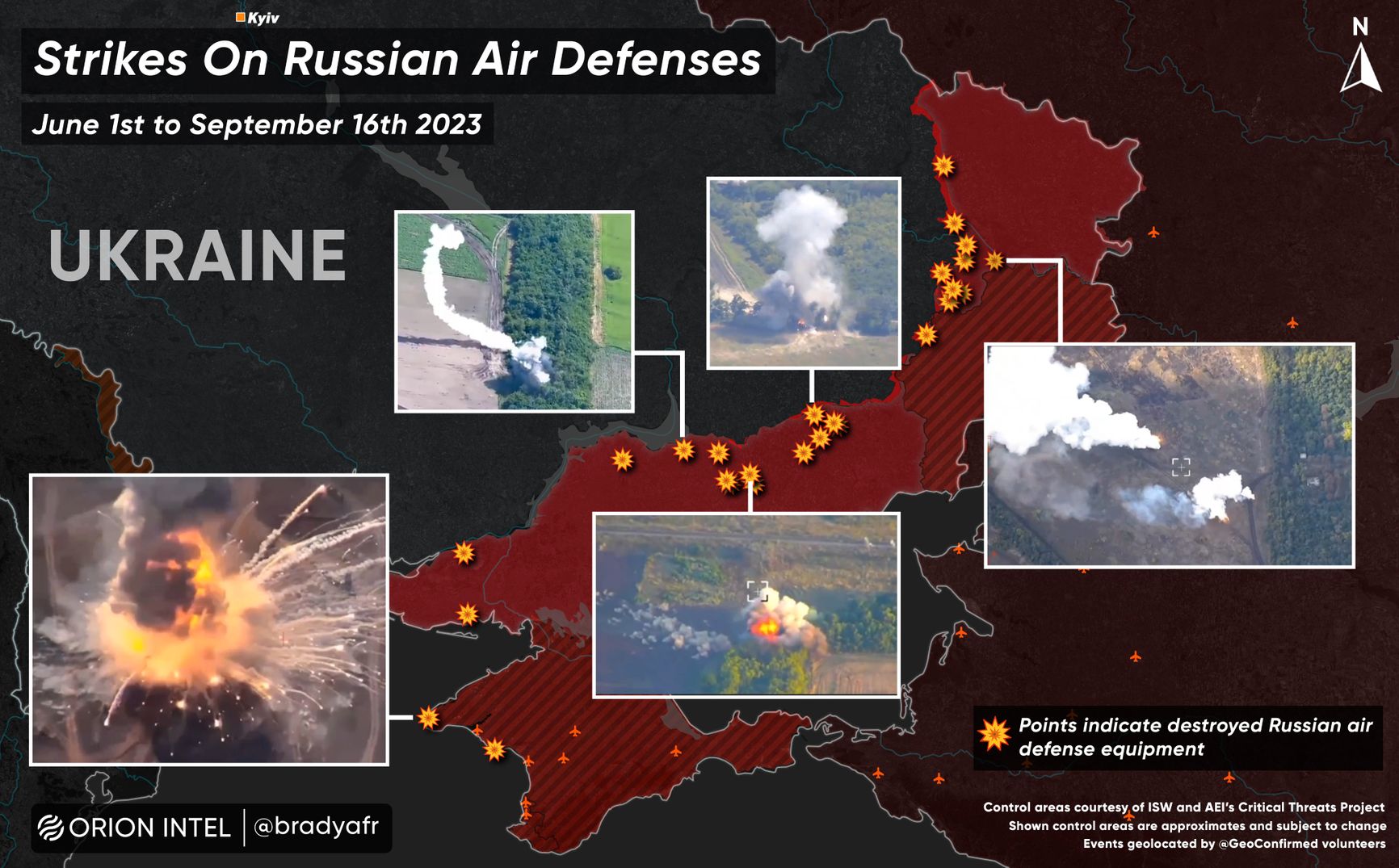 Опубликована карта с геолоцированными местами ударов по российским системам ПВО с 1 июня по 16 сентября 2023 года. Всего зафиксировано 25 таких эпизодов.