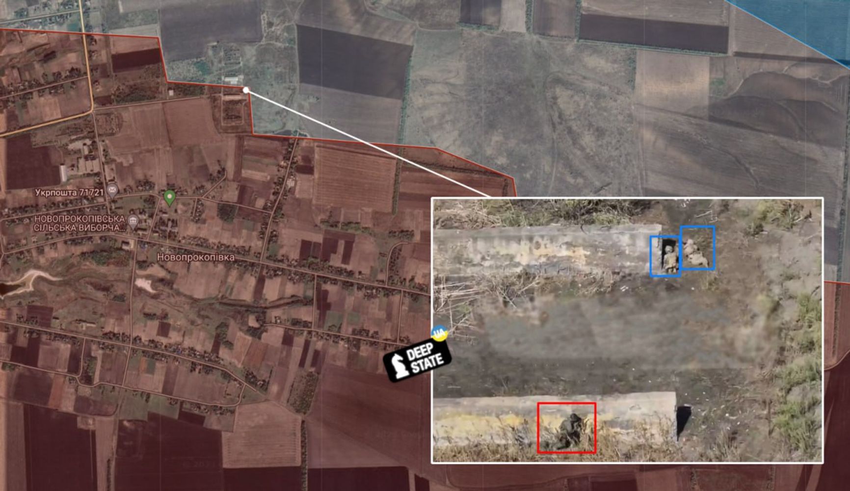 Украинский OSINT-ресурс DeepState геолоцировал резонансное видео (запись доступна тут) боя между российскими и украинскими военнослужащими прямо на северной окраине Новопрокоповки.