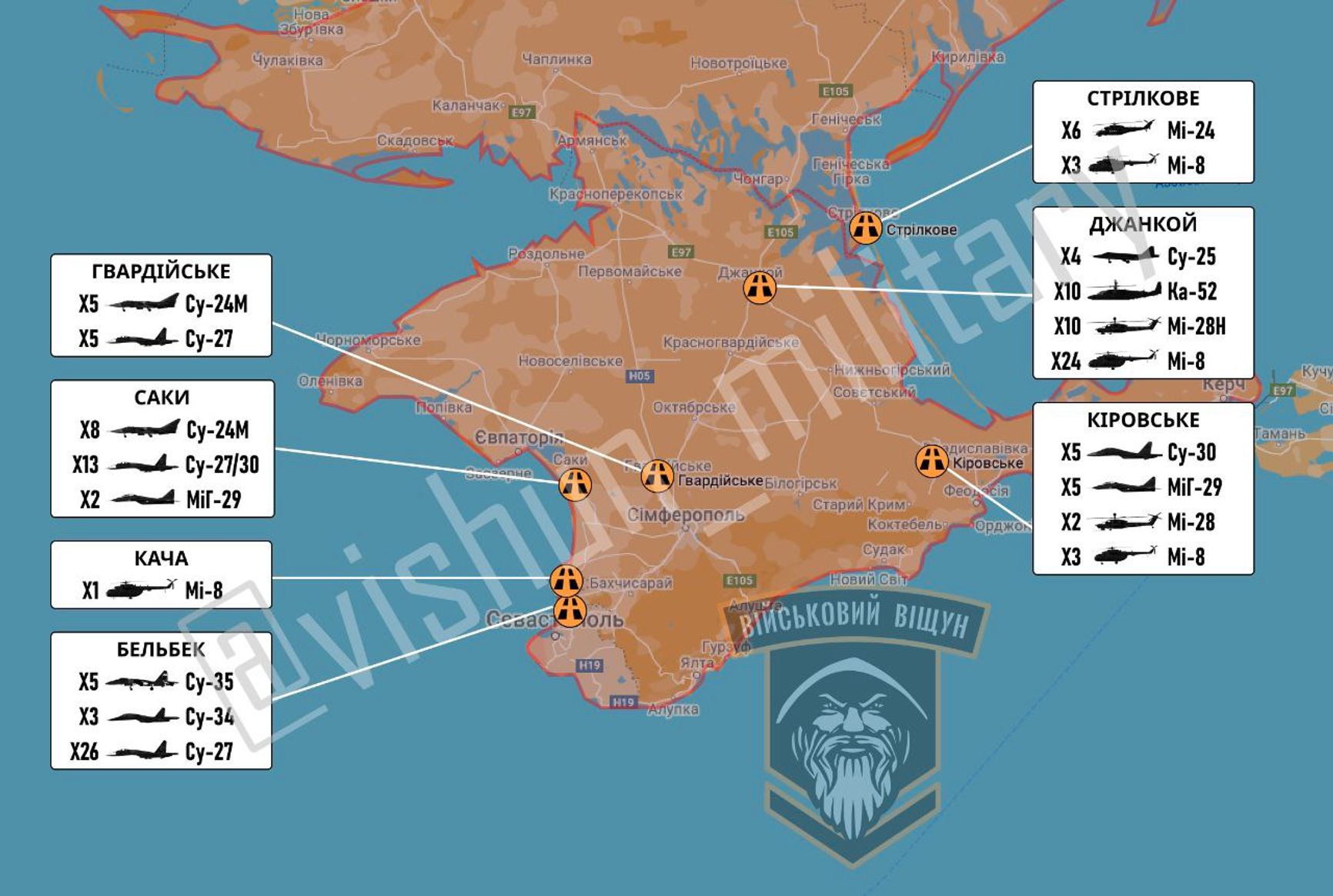 Также показано размещение авиации на территории оккупированного Крыма, для чего россияне используют семь основных аэродромов и около четырех вспомогательных. По состоянию на начало сентября 2023 года, на них базировались 81 истребитель и 59 вертолетов.