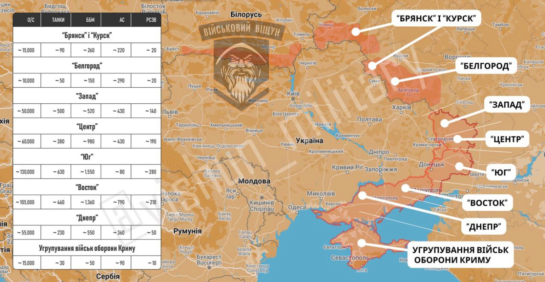 Украинский OSINT-ресурс «Військовий Віщун» публикует данные по составу сил и средств российской группировки в Украине и прилегающих регионах РФ. Общая группировка российских войск, которая вовлечена в боевые действия, разделена на восемь «направлений».