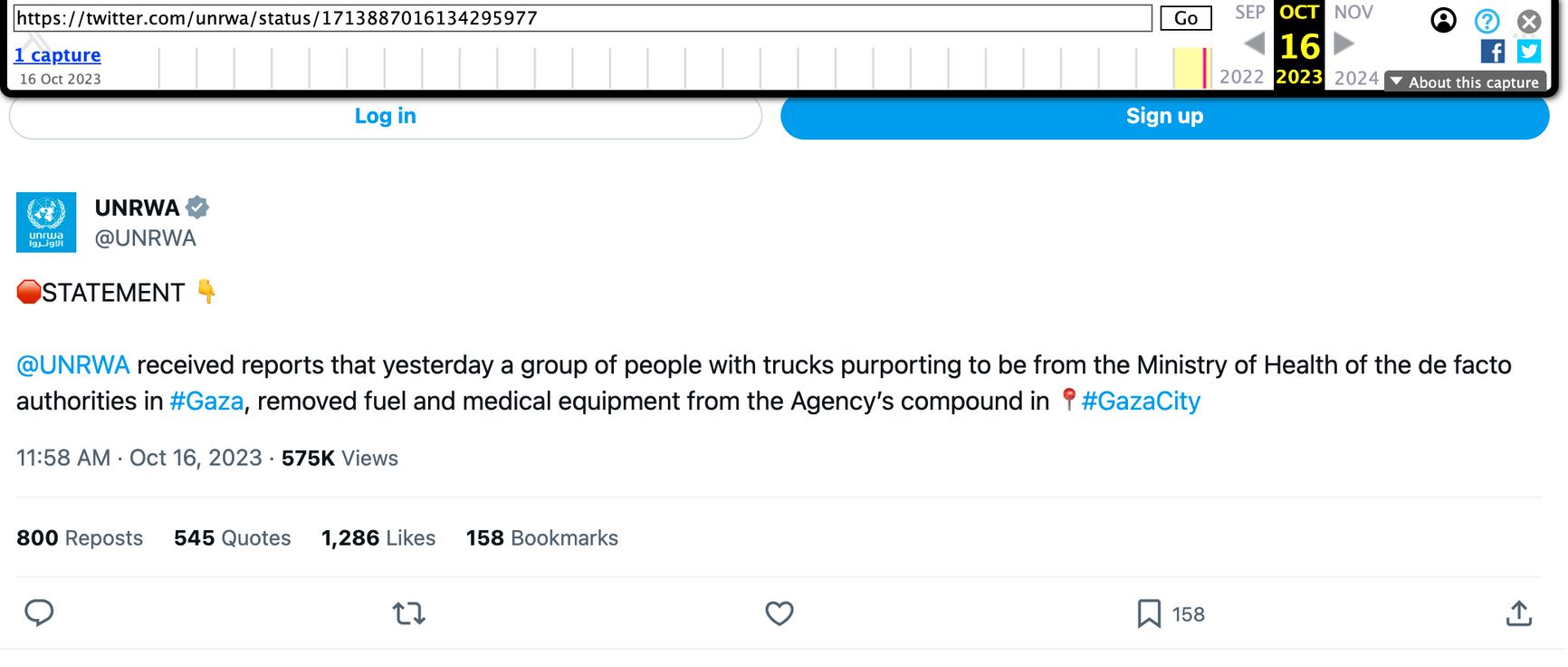 В соцсети X (экс-Twitter) Ближневосточное агентство ООН для помощи палестинским беженцам и организации работы (БАПОР) опубликовало сообщения о том, что боевики ХАМАС 15 октября похитили лекарства и топливо, предназначенные для мирных жителей, со складов БАПОР в секторе Газа. В сообщениях агентства говорилось: «Люди в грузовиках [с опознавательными признаками] местного Министерства здравоохранения, контролируемого ХАМАС, загрузили грузовики медикаментами и топливом». Также в сообщениях БАПОР утверждалось, что сотрудники агентства эвакуировались оттуда до ограбления — в пятницу, 13 октября.