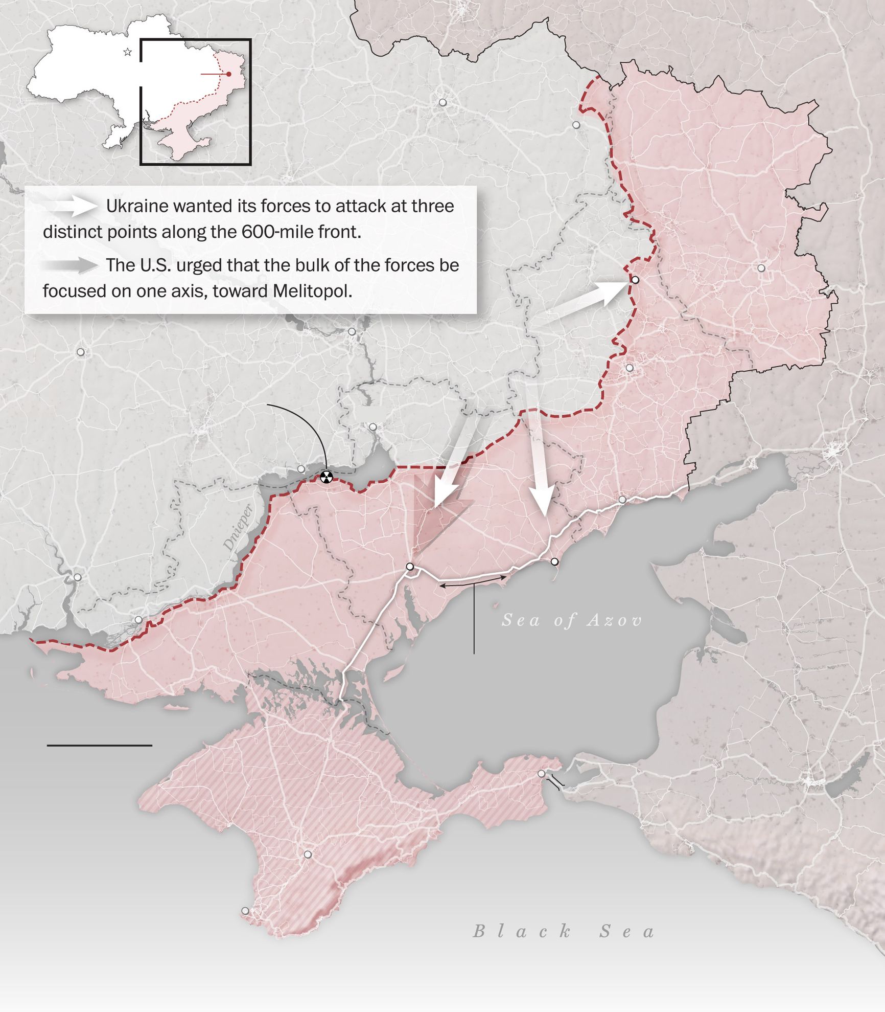Соединенные Штаты выступали за целенаправленное наступление на южном направлении, но руководство Украины считало, что их войска должны атаковать на трех направлениях: мелитопольском, бердянском и бахмутском.
